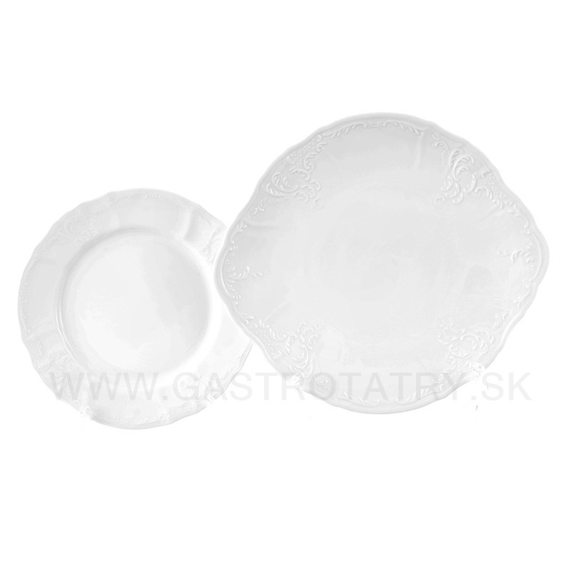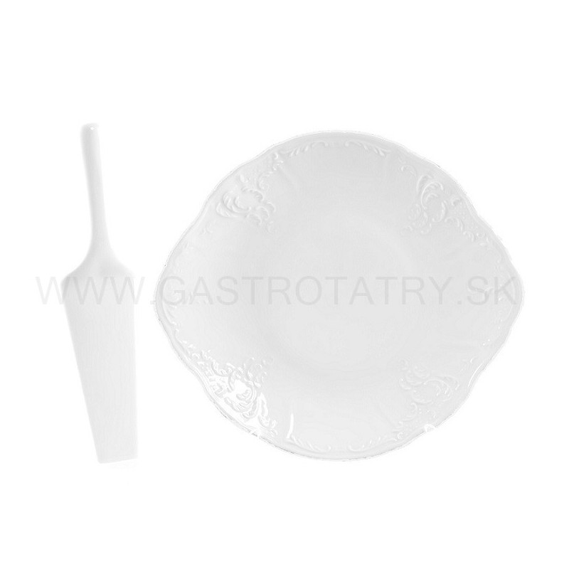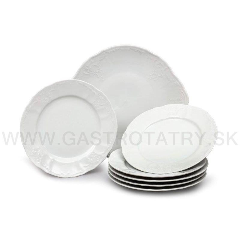 Karlovarský porcelán Bernadotte - Koláčová súprava biela 7 dielna. Koláčová súprava je vhodná do mikrovlnnej rúry a umývačky riadu. Obsahuje: 1 x tanier koláčový 27 cm, 6 x tanier dezertný 19 cm