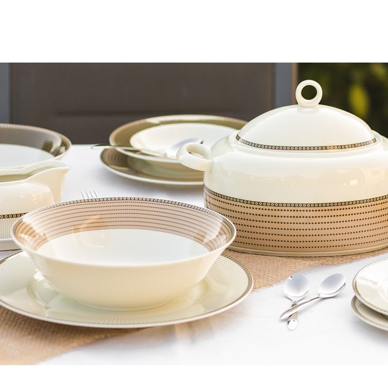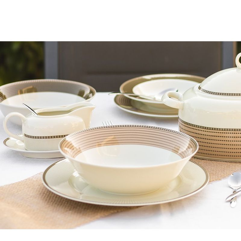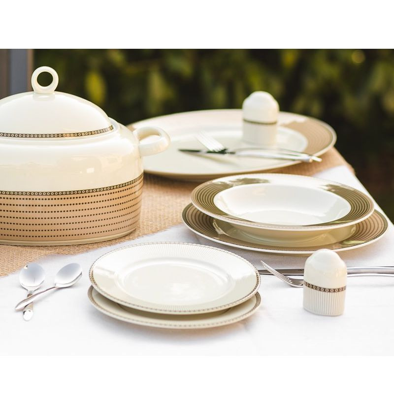 Elegantná moderná obedová súprava vo farbe slonovej kosti. Porcelán je sýtejšej farby, ladenej do krémovo žltej, čo pôsobí pekným štýlom. Dizajn v rôznych odtieňoch hnedej pekne ladí s porcelánom vo farbe slonovej kosti. Súprava pekne vynikne v modernej ako aj klasickej kuchyni.