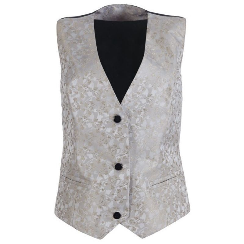 Dámska čašnícka vesta v krémovej farbe. Dámska vesta na 3 gombíky, dve predné vrecká, zadný diel v čiernej farbe, sťahovanie na gombíky vzadu, 100% polyester.