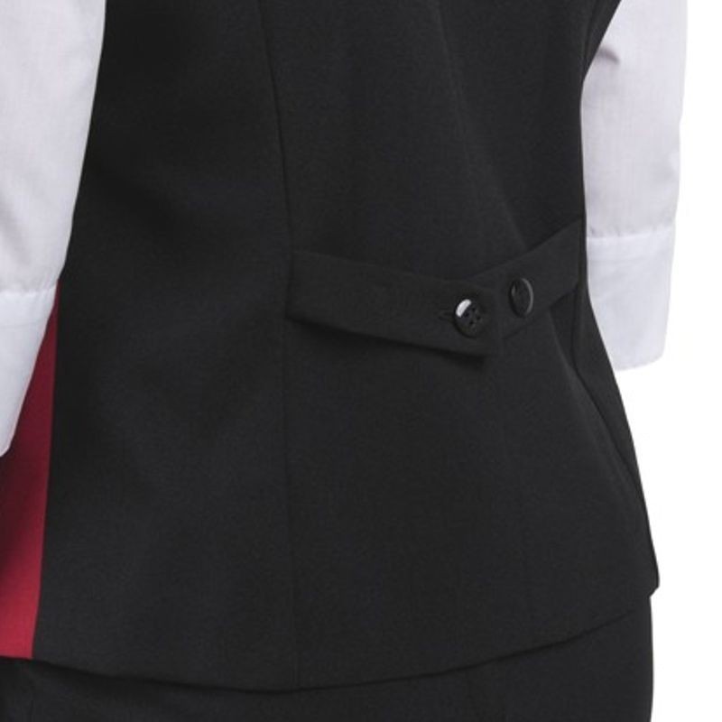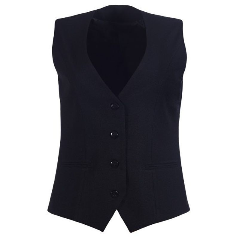 Klasická dámska čierna vesta. Dámska vesta na 4 gombíky, dve predné vrecká, sťahovanie na gombíky vzadu, 100% polyester, pranie na 30°C.