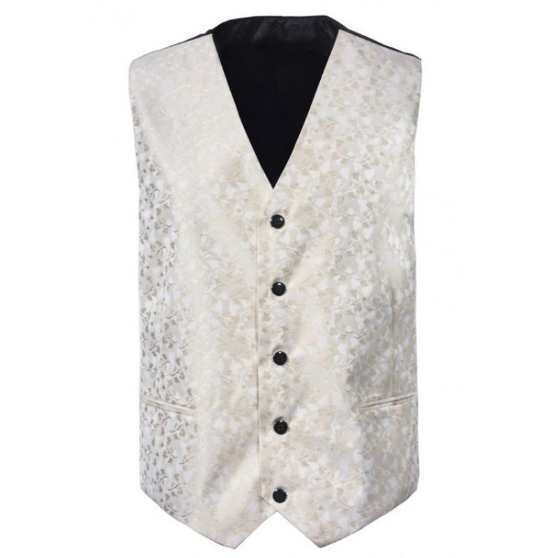Pánska čašnícka vesta v krémovej farbe. Pánska vesta na 5 gombíkov, dve predné vrecká, zadný diel v čiernej farbe, sťahovanie na pracku vzadu, 100% polyester.
