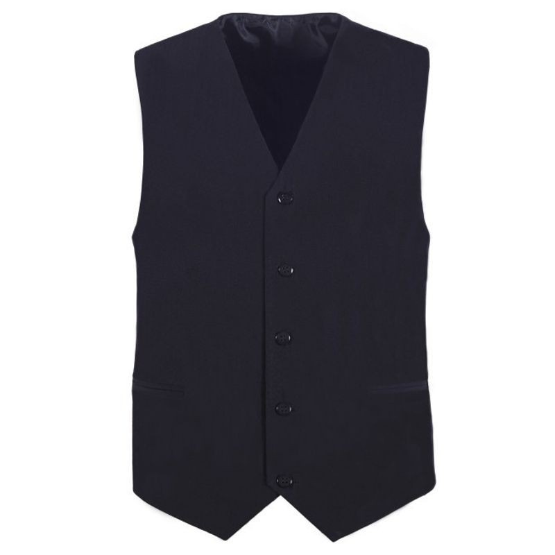Pánska vesta v čiernom prevedení, pánska vesta na 5 gombíkov, dve predné vrecká, sťahovanie na pracku vzadu, 100% polyester, pranie na 30°C.