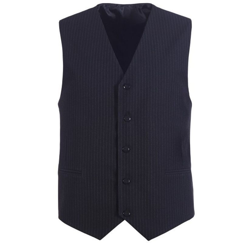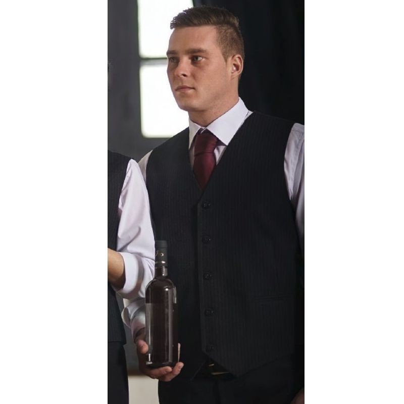Prúžkovaná čašnícka vesta. Pánska vesta na 5 gombíkov, vytkávaný jemný prúžok, dve predné vrecká, sťahovanie na pracku vzadu, 100% polyester, pranie na 30°C.