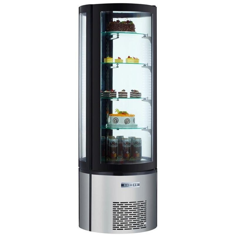 Chladiaca vitrína okrúhla ▪ objem 360 L, LED osvetlenie ▪ otváracie dvierka ▪ 5 sklenených políc ▪ so 4 kolieskami ( 2 brzdené ), rozmery: Ø680x1750 mm, teplota 2 °C ~ 8 °C, prípojka 230 V, príkon 0,46 kW