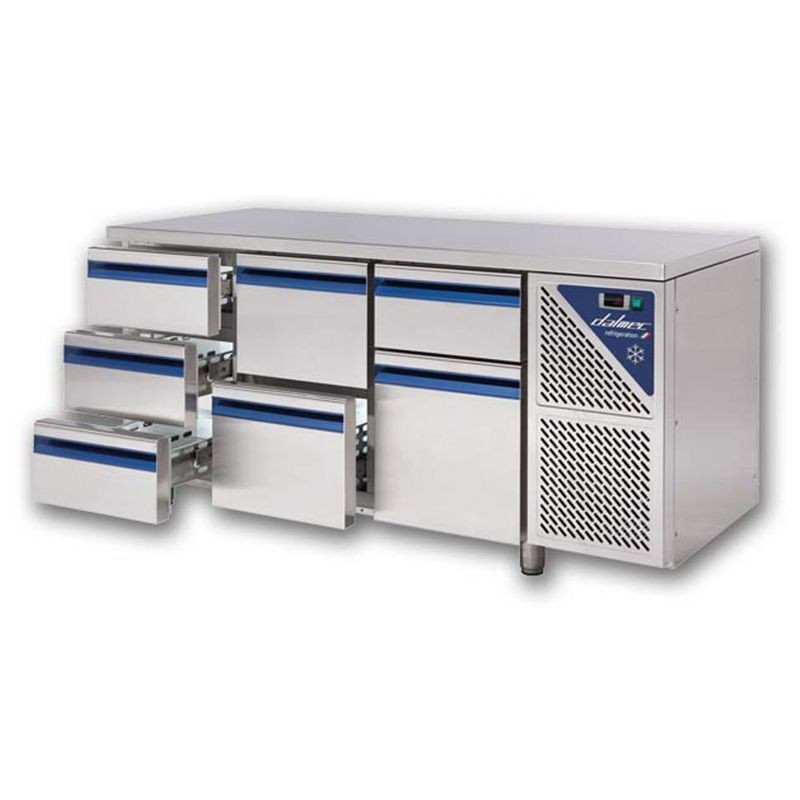 Chladiaci stôl DALMEC so zásuvkami - v kombinácii (232): dvojzásuvka+dvojzásuvka(1/2+1/3)+dvojzásuvka - kvalitné talianske prevedenie - digitálny dotykový termostat - cirkulačné chladenie - vonkajšie aj vnútorné vyhotovenie z nerezu - aktívne odmrazovanie a automatické odparovanie pomocou nerezovej špirály - 1 ks roštu GN 1/1 k jedným dverám - bez lemu (možnosť objednania s lemom) - tropikalizovaný agregát do +42°C (65% vlhkosť) - prípojka: 230 V - výkon: 320 W - rozmery: 1730x700x850 mm