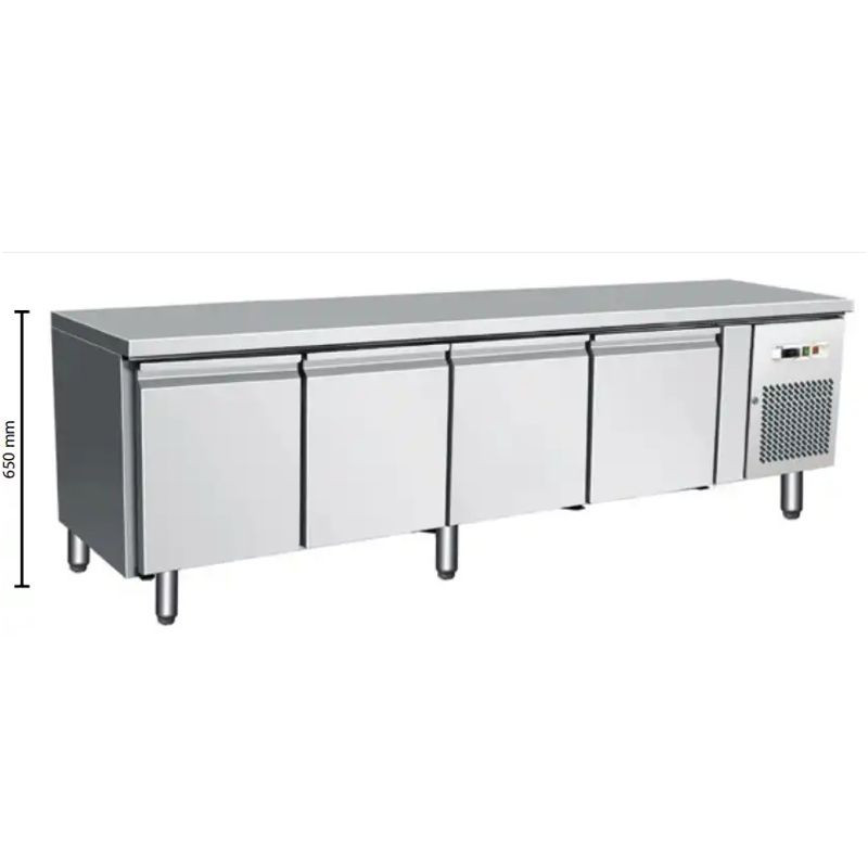 Štvordverový chladiaci stôl znížený, rozmery 2230 x 700 x 650 mm, objem 350 l. Prípojka/Príkon (V/kW) 230/0,26 ▪ bez zadného lemu ▪ s nerezovou pracovnou doskou ▪ agregát na pravej strane