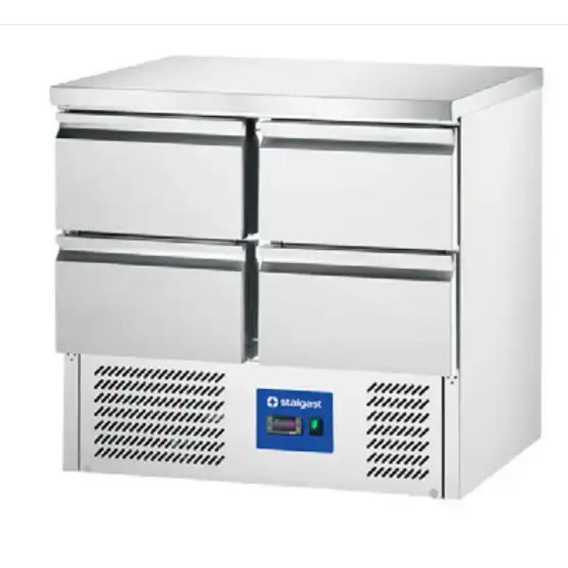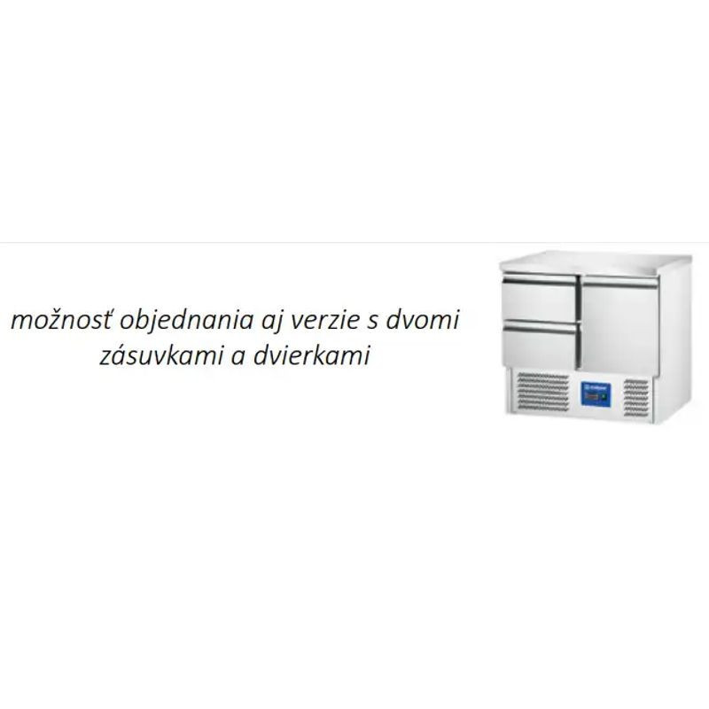 Štvorzásuvkový chladiaci stôl, objem 220 l, rozmery 900 x 700 x 875 mm, teplota +2 ~ +8°C. Prípojka/Príkon (V/kW) 230/0,17 ▪ so 4 zásuvkami GN 1/1 -150 mm, možnosť objednania aj verzie s dvomi zásuvkami a dvierkami