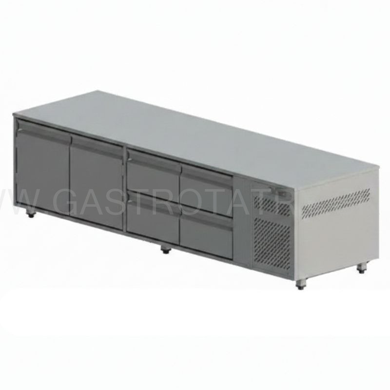 Chladiaca podstavba na gastronádoby, rozmer (ŠxHxV) 2180x660x600 mm, kapacita 415 l, príkon 332 W, vedenie pre GN 1/1 ▪ 4x zásuvka pre GN 1/1 ▪ teplotný rozsah +2°C / +8°C pri okolitej teplote max. 32°C ▪ napájanie 230V / 50Hz. Bez pracovnej dosky. Chladivo R134a.