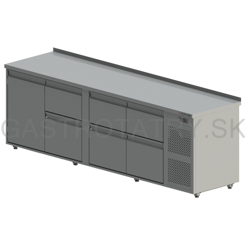 Chladiaci pult na nápoje, rozmer (ŠxHxV) 2690x700x900 mm, kapacita 869 l, príkon 480 W, pohyblivá polica na nápoje ▪ 6x zásuvka na nápoje ▪ teplotný rozsah +2°C / +8°C pri okolitej teplote max. 32°C ▪ napájanie 230V / 50Hz, chladiace médium R134a, nasávanie a výfuk spredu