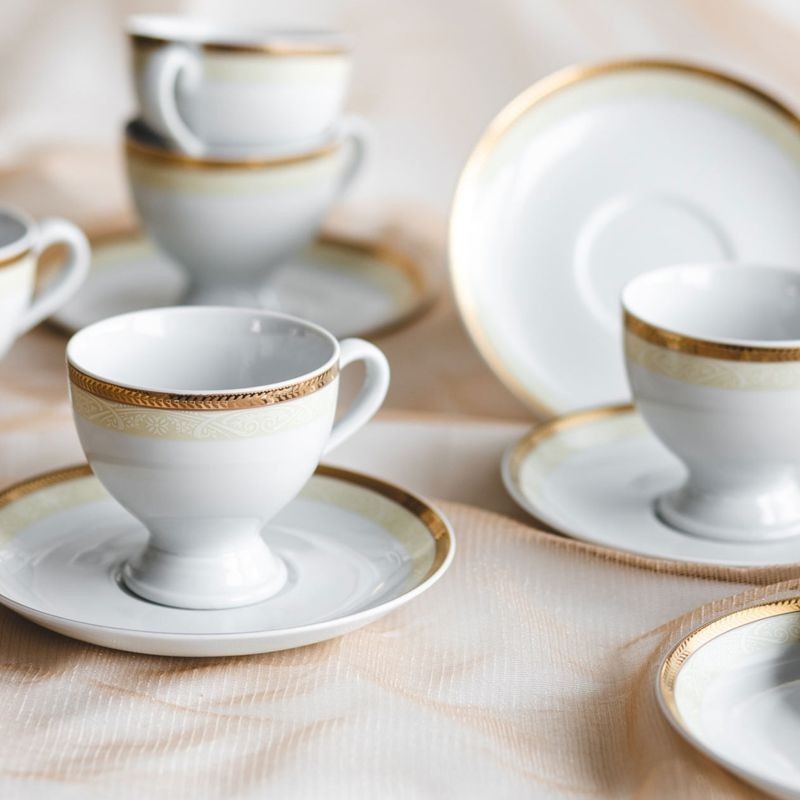 Karlovarský porcelán - CHRISTINE zlato-žltá šálky a po dšálky 160 mm 12 dielna. Nie je vhodná do mikrovlnnej rúry ani do umývačky riadu.