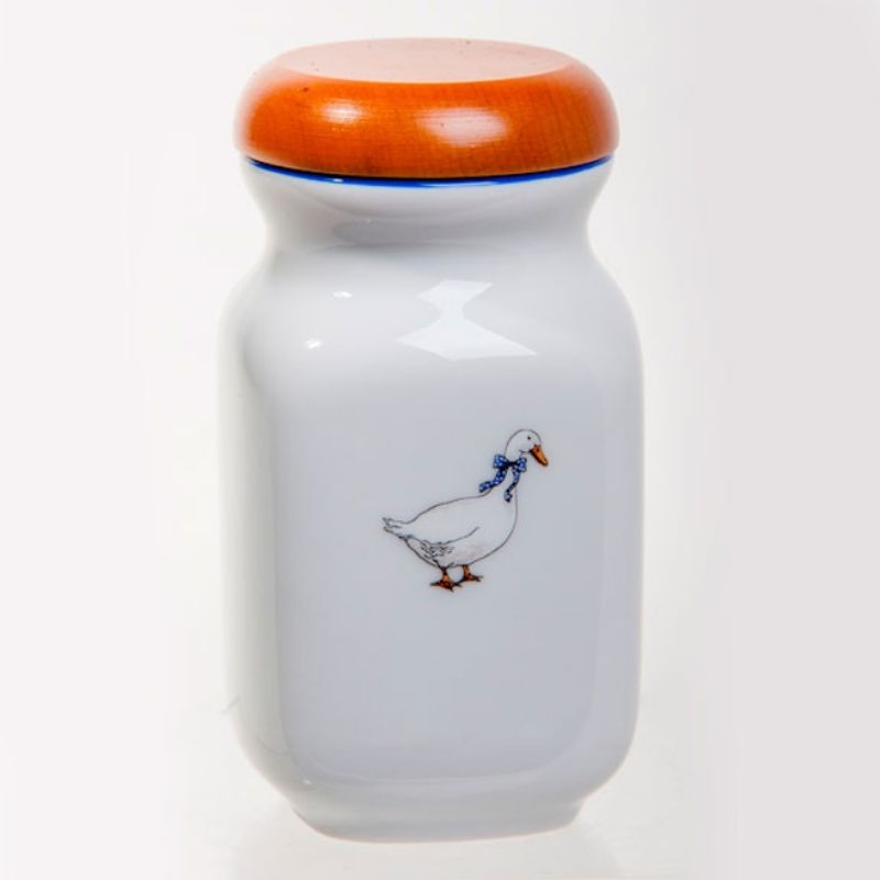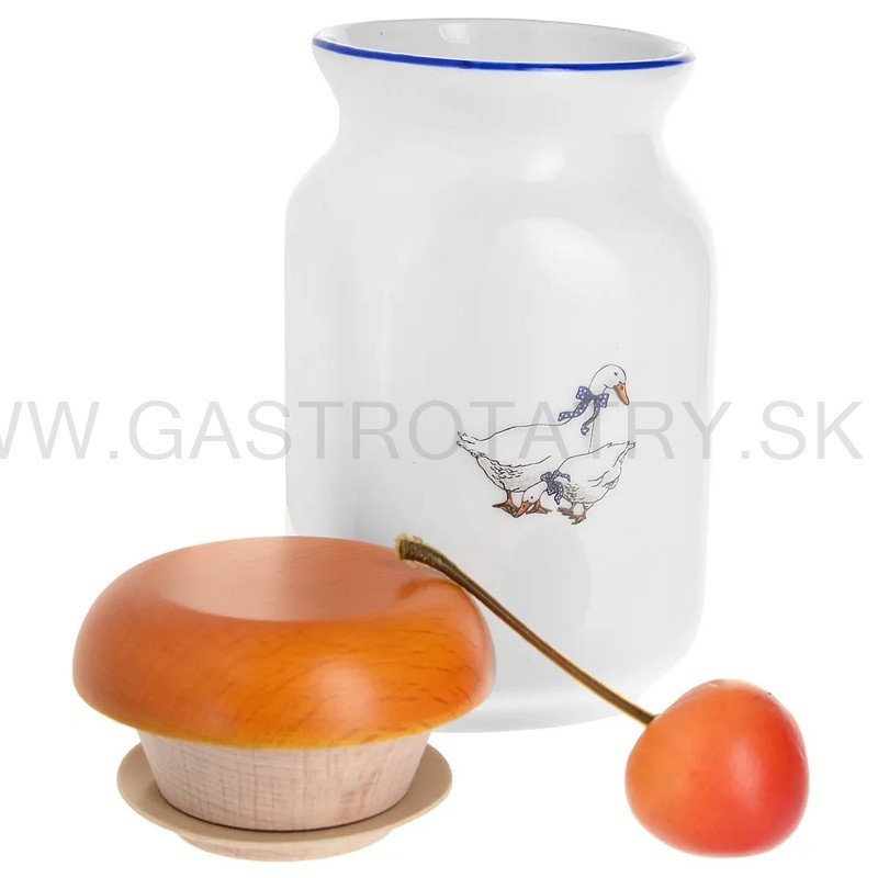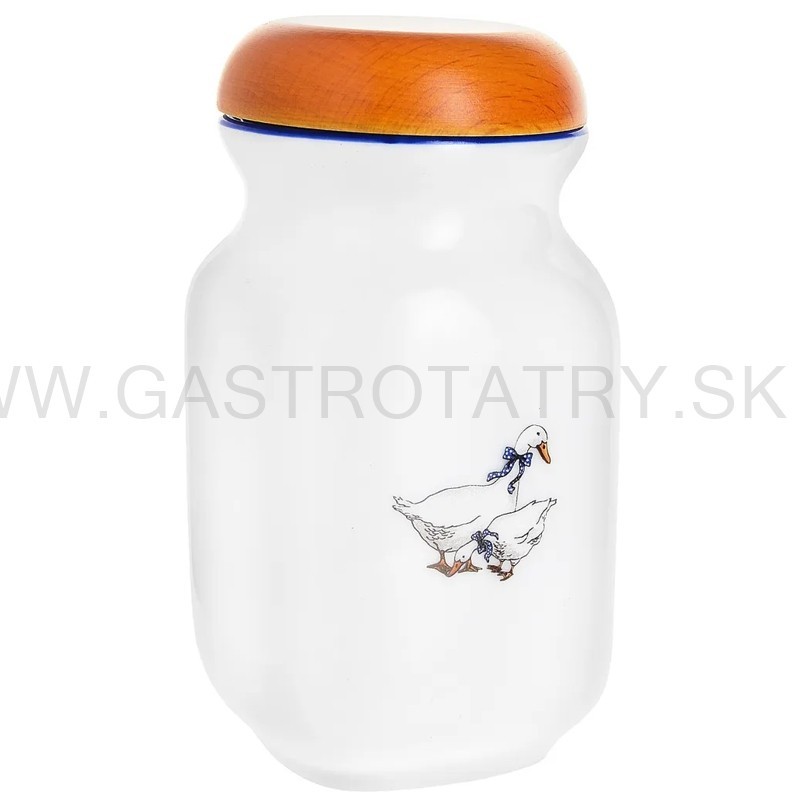Karlovarský porcelán - Dóza na potraviny s dreveným vekom Husi Objem: 0,2 l. Výška s vekom: 12 cm. Priemer: 6,5 cm. Telo nádoby je vyrobené z českého porcelánu, zdobené vzorom s husami a modrým okrajom. Hladké drevené veko tesne zapadne do nádoby. Určené na skladovanie korenia a iných sypkých produktov. Možno umývať v umývačke riadu.