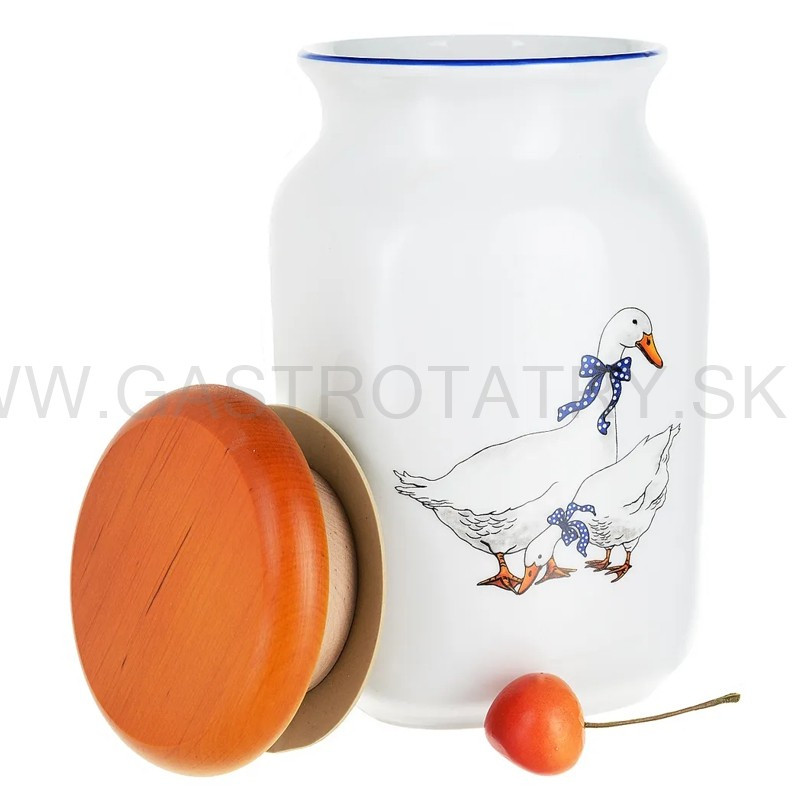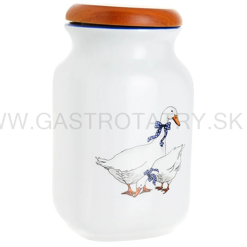 Karlovarský porcelán - Dóza na potraviny s dreveným vekom Husi. Objem: 1 l. Výška s vekom: 19 cm. Priemer: 11,7 cm. Telo nádoby je vyrobené z českého porcelánu, zdobené vzorom s husami a modrým okrajom. Hladké drevené veko tesne zapadne do nádoby. Určené na skladovanie korenia, obilnín a iných sypkých produktov. Možno umývať v umývačke riadu.