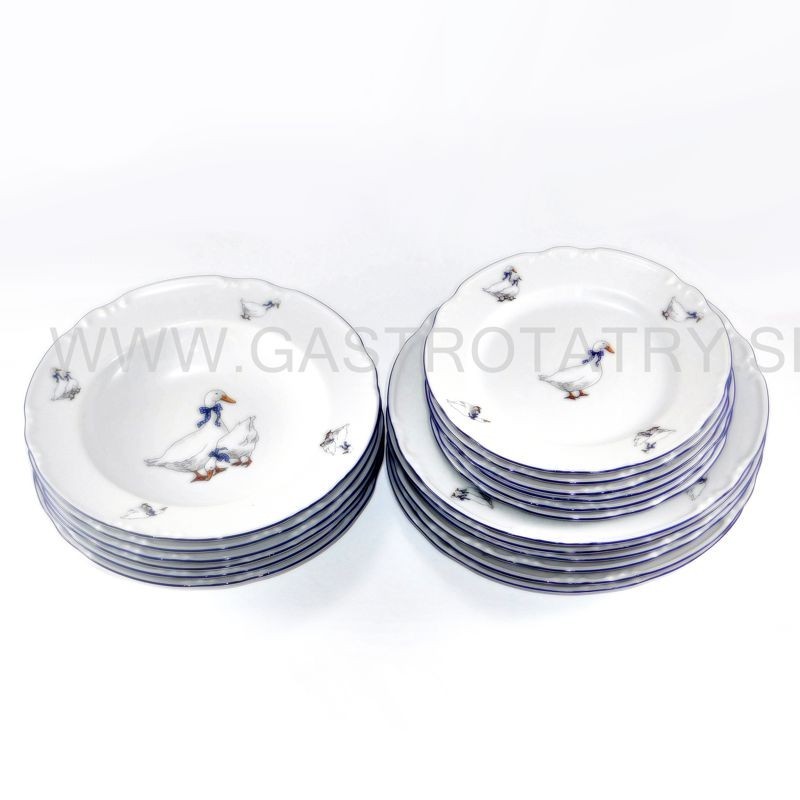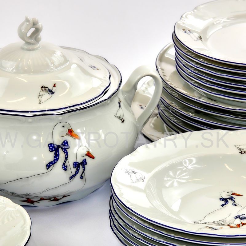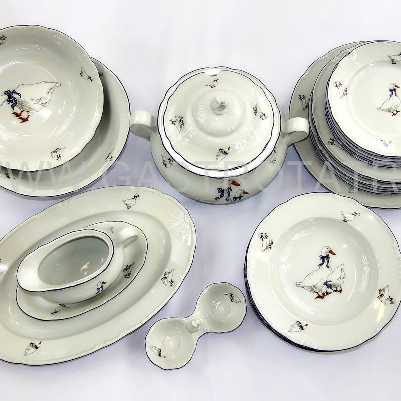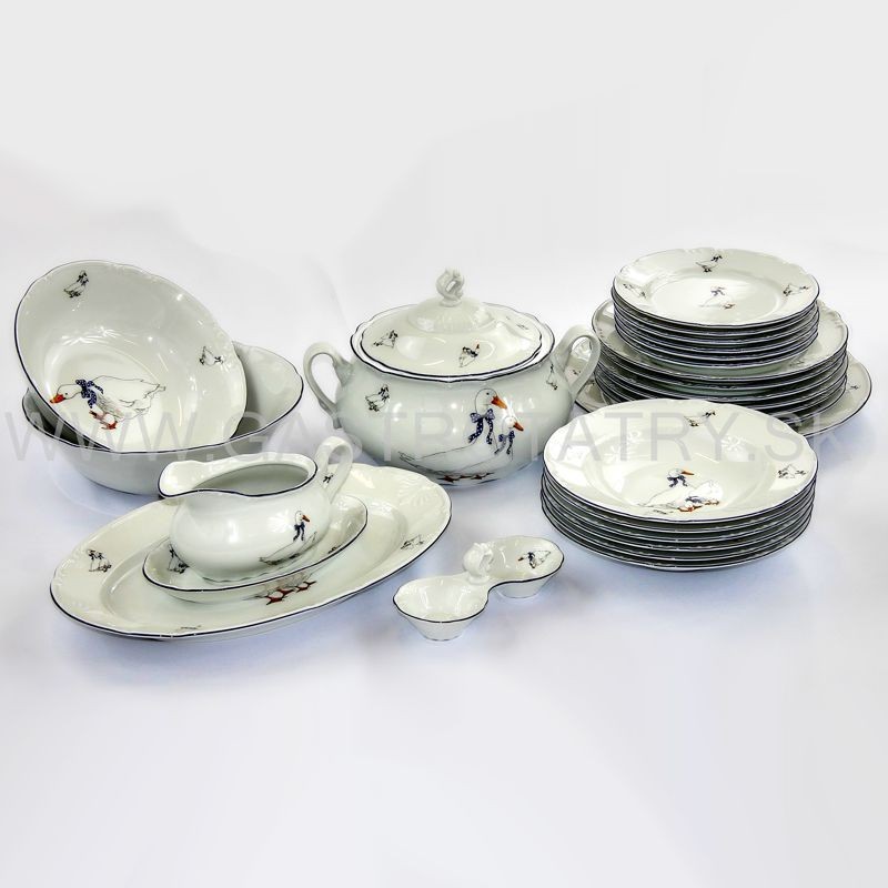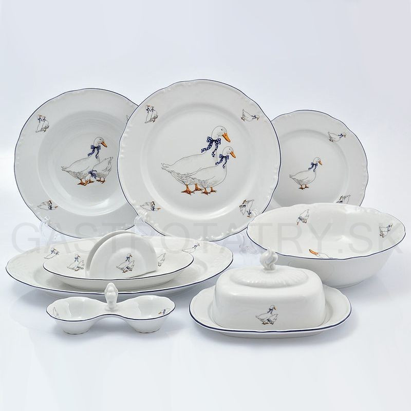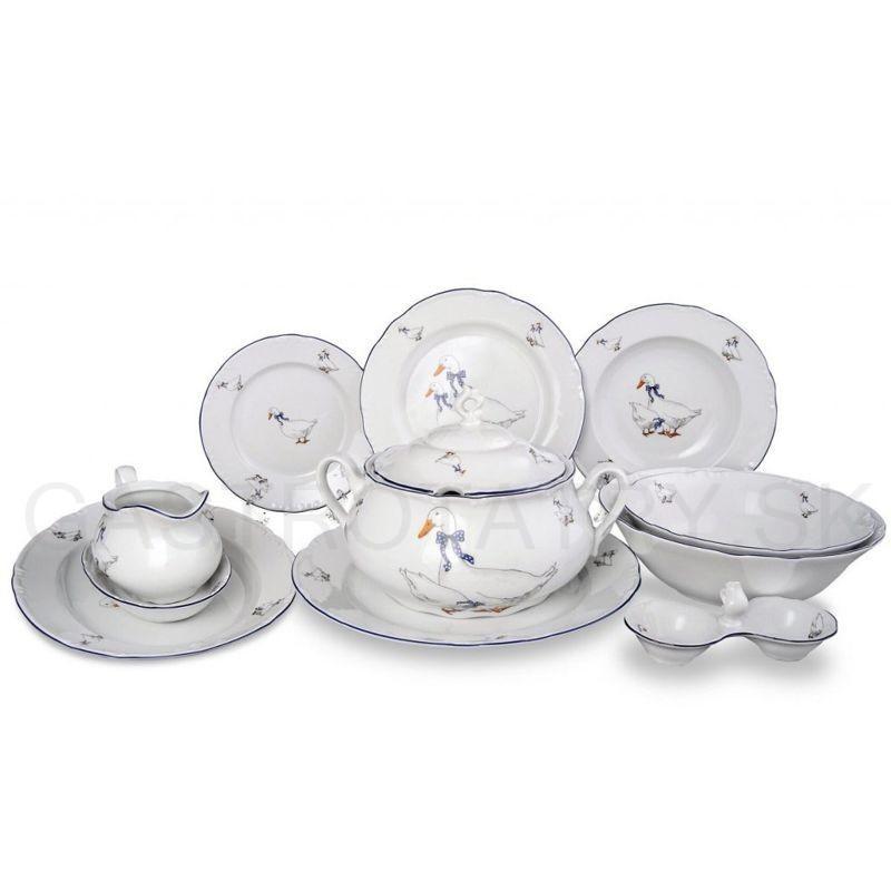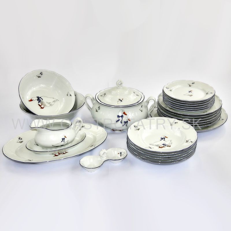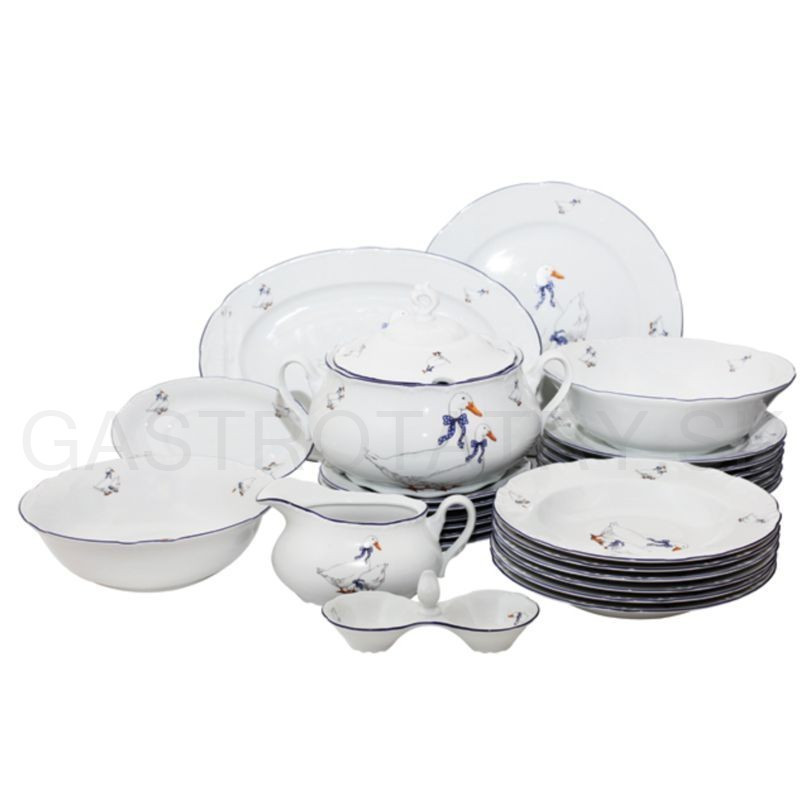 Obsahuje: 1x misa polievková s vekom 2,3 l, 1x omáčnik s podšálkou, 1x misa kompotová 25 cm, 1x misa kompótová 23 cm, 1x misa oválna 36 cm, 1x misa plytká 30 cm, 6x tanier plytký 24 cm, 6x tanier hlboký 23 cm, 6x tanier dezertný 19 cm, 1x solnička-korenička 2 dielna.