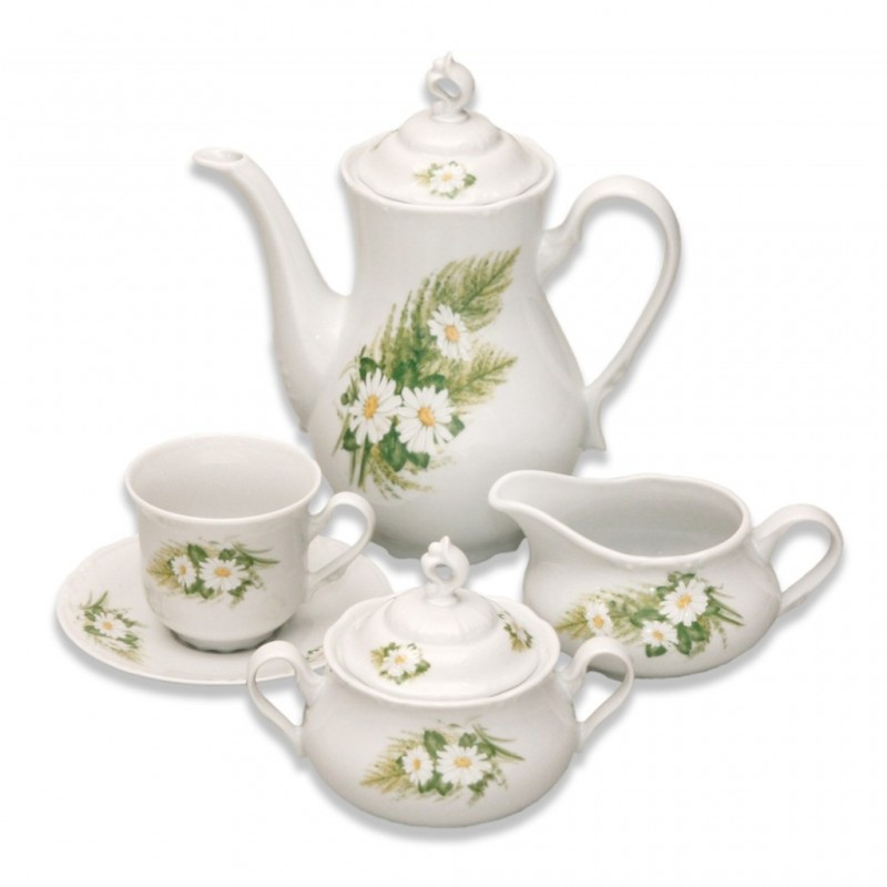 Obsahuje : Obsahuje: 6 x šálka 160 ml, 6 x podšálka 13,5 cm, 1 x kávová kanvica 1,2 l, 1 x viečko ku kanvici, 1 x cukornička 0,25 l, 1 x viečko k cukorničke, 1 x mliekovka 0,25 l
