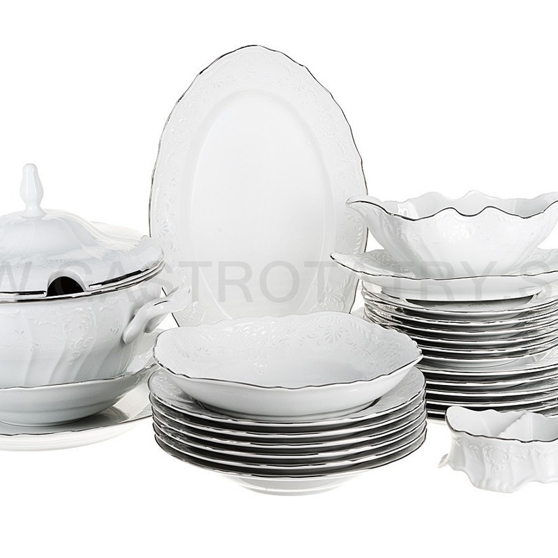 Karlovarský porcelán BERNADOTTE damašek (svadobný dekor) + platinová linka obedová súprava 26 dielna.