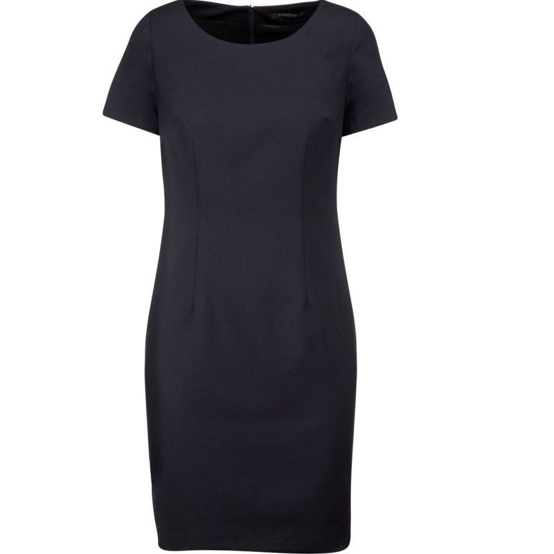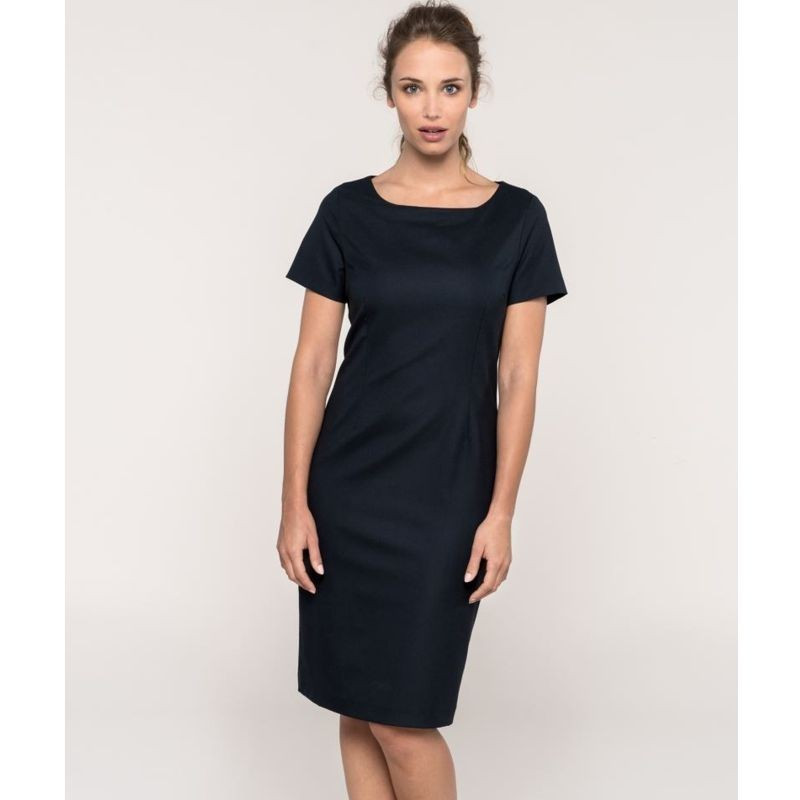 Dámske šaty zo strečového materiálu. Klasický strih, nenápadné zapínanie vzadu. Material: 220g/m², 64% polyester, 34% viscose, 2% elastane.