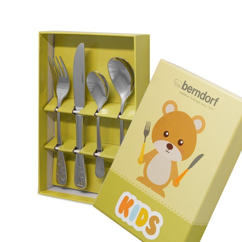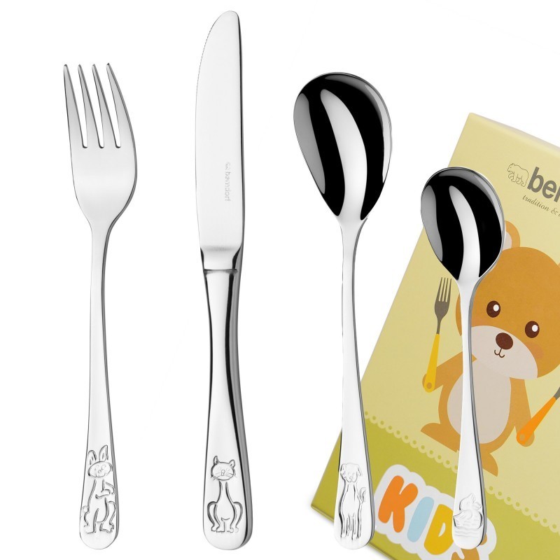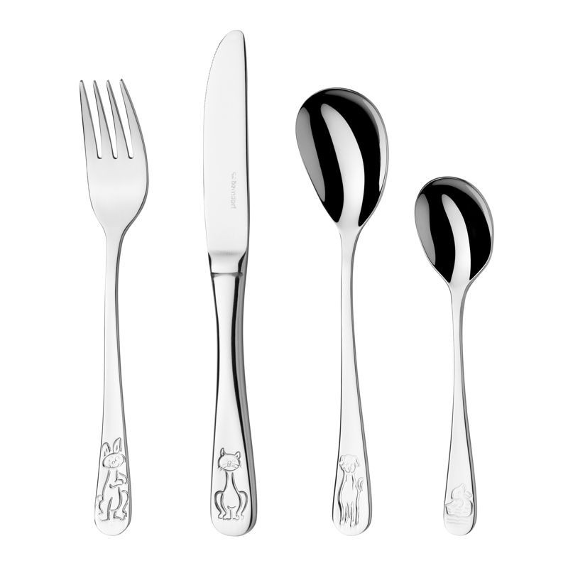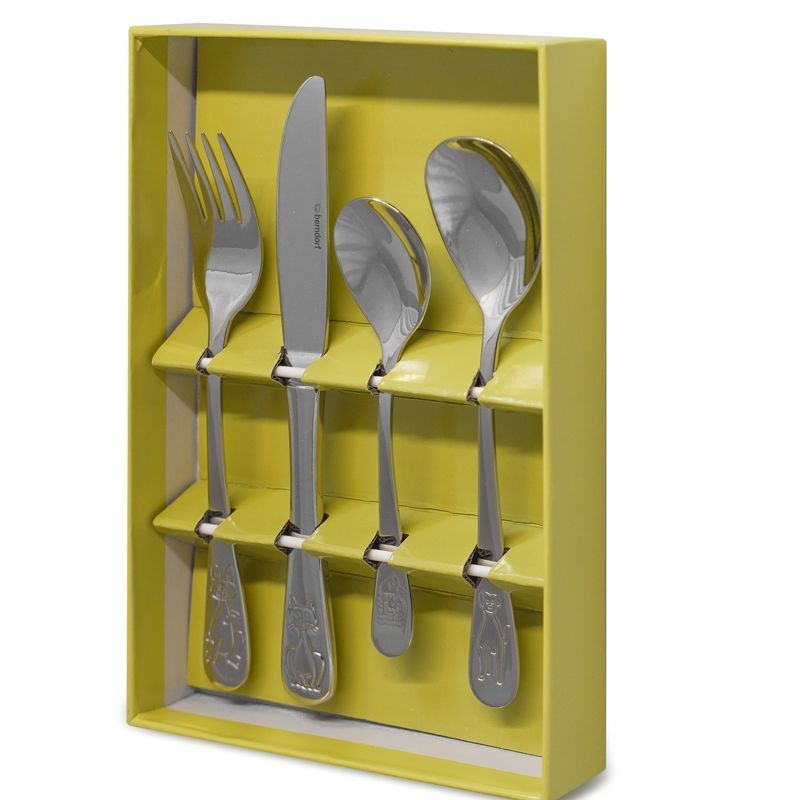 4 dielna súprava detského príboru zvieratka Detský príbor so zvieratkami na držadlách. Súprava detského príboru obsahuje: 1 x lyžica detská (158 mm), 1 x vidlička detská (163 mm), 1 x nôž detský (182 mm), 1 x lyžička detská (130 mm). Balenie : červená kazeta