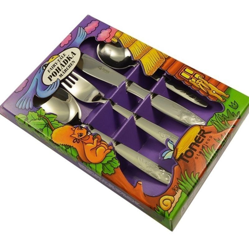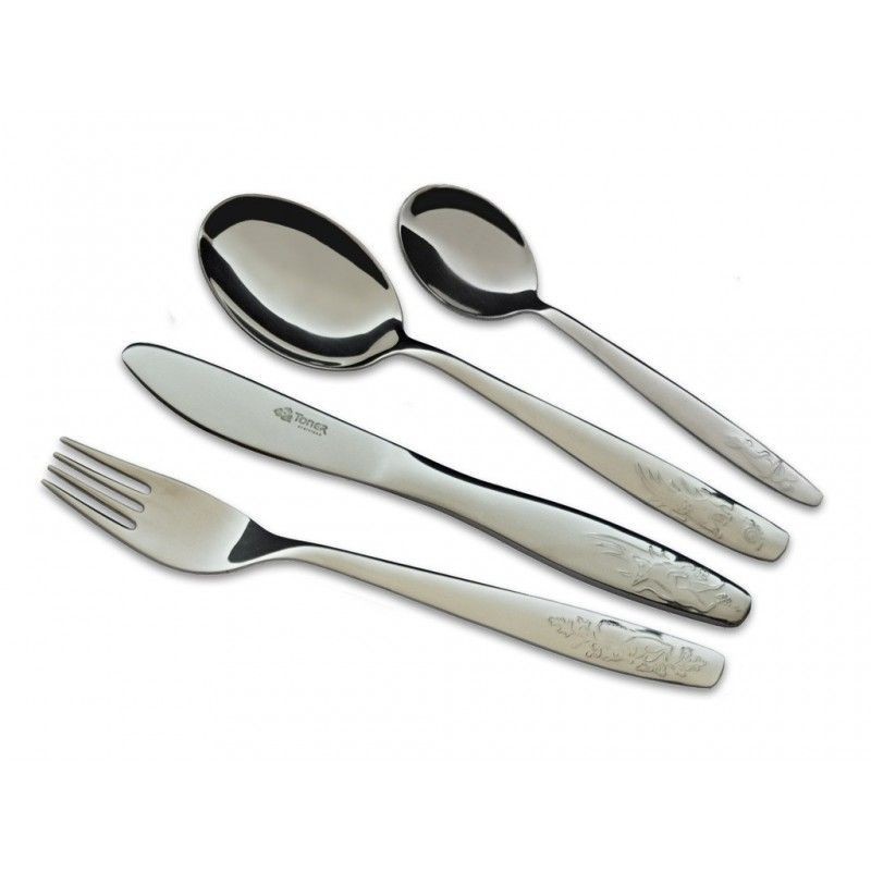 Detský príbor BABY - 4 diely - súprava pre 1 osobu v darčekovom balení. Obsah: lyžica 1 x, vidlička 1 x, nôž 1 x, čajová lyžička