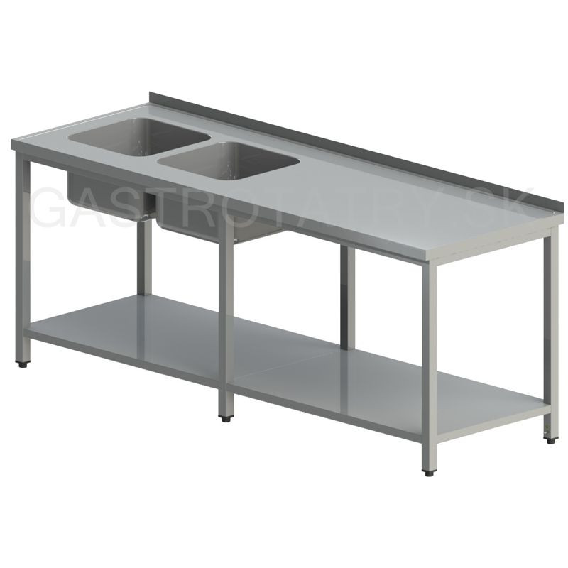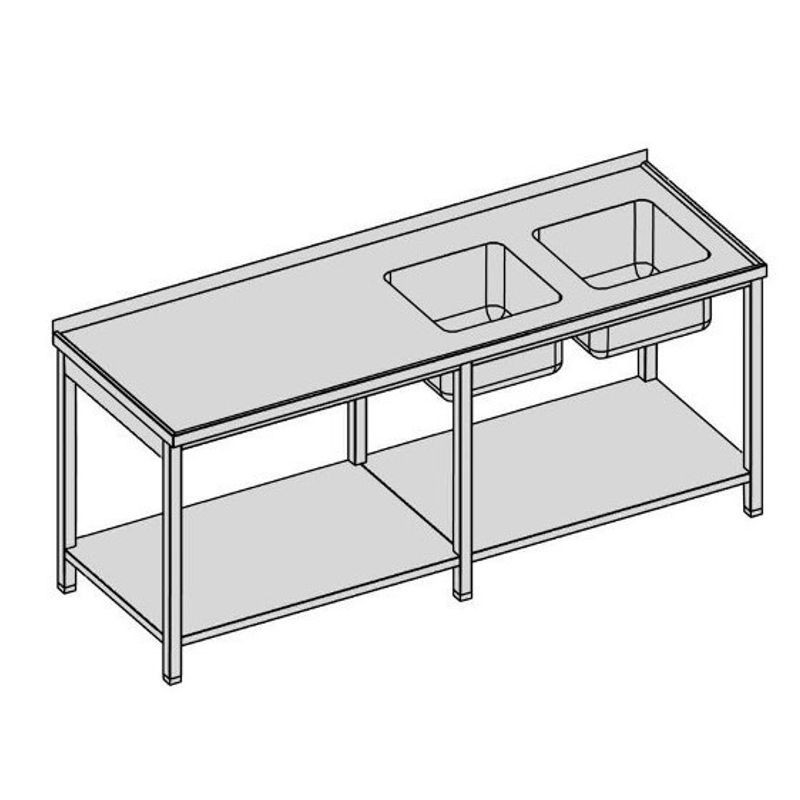 Umývací stôl, dvomi drezmi a policou, dlhý, hĺbka 600, 700, 800 mm, šírka 2000 - 2800 mm, výška stola štandardne 850 mm ▪ možnosť vyhotovenia bez zadného lemu ▪ vrch police 150 mm od zeme ▪ nosnosť police 50 kg