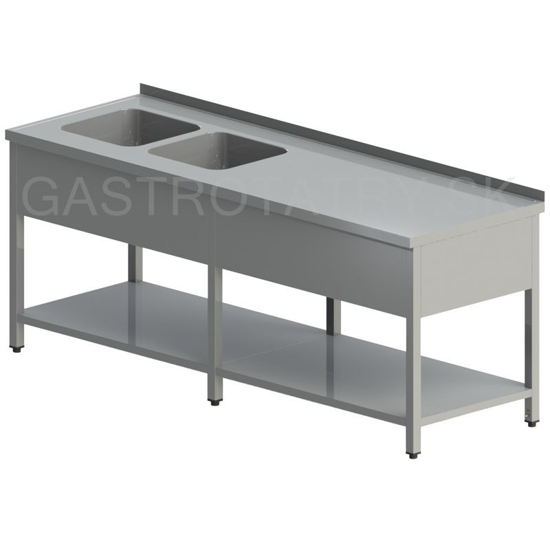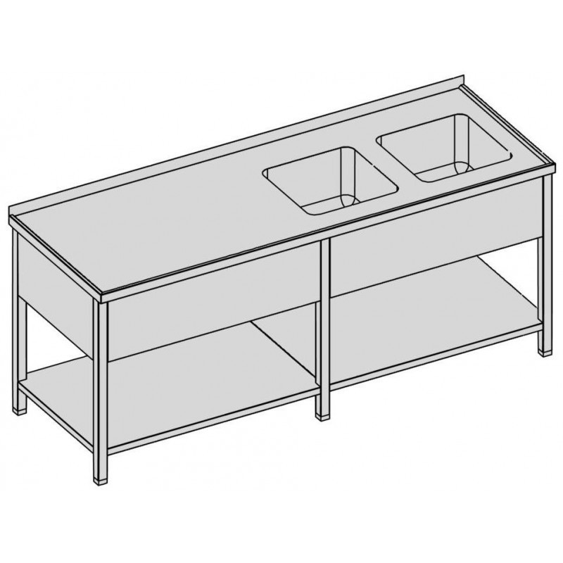 Umývací stôl s dvomi drezmi s policou a krytom dlhý, hĺbka 600, 700, 800, šírka 2000 - 2800 mm, výška stola štandardne 850 mm ▪ možnosť vyhotovenia bez zadného lemu ▪ vrch police 150 mm od zeme ▪ nosnosť police 50 kg ▪ krytovanie