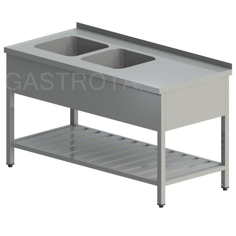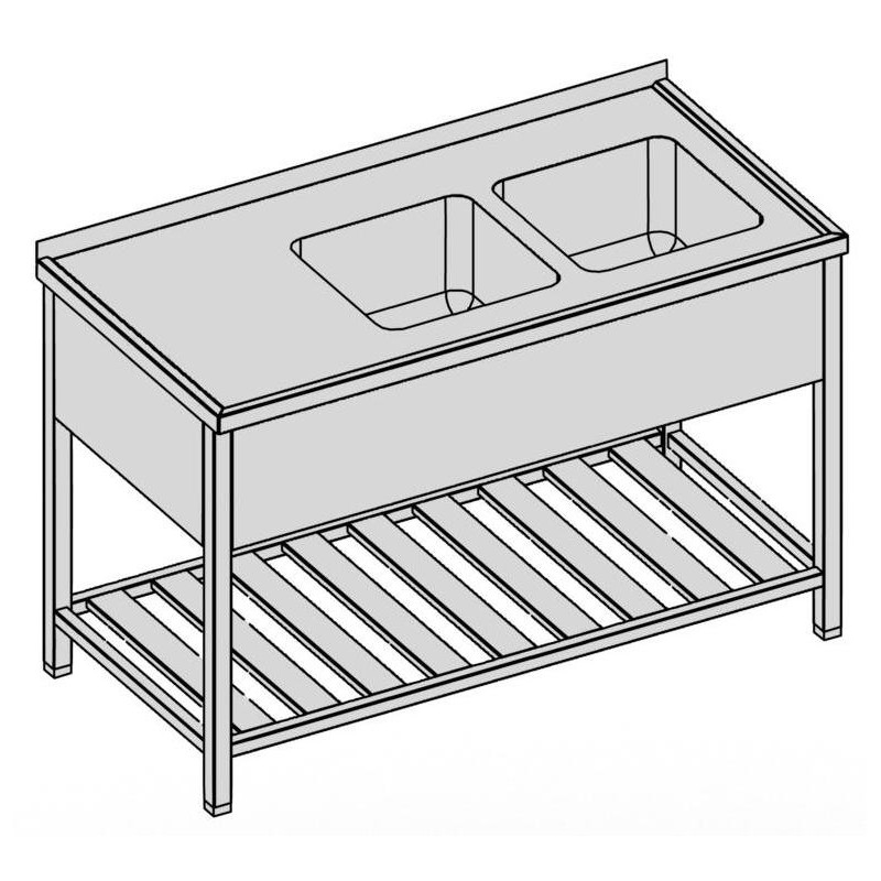 Umývací stôl s 2 drezmi, roštovou policou a krytom, hĺbka 600, 700, 800 mm, šírka 1100 - 1900 mm, výška stola štandardne 850 mm ▪ možnosť vyhotovenia bez zadného lemu ▪ roštová polica ▪ vrch police 150 mm od zeme ▪ nosnosť police 50 kg ▪ krytovanie