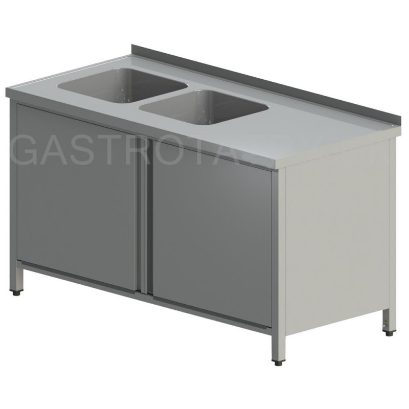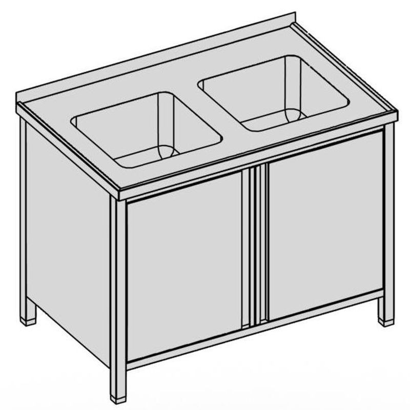 Umývací stôl s dvomi drezmi skrinkový, hĺbka 600, 700, 800 mm, šírka 1100 - 1400 mm, výška stola štandardne 850 mm ▪ možnosť vyhotovenia bez zadného lemu ▪ vrch spodnej police 150 mm od zeme ▪ nosnosť police 50 kg ▪ otváravé dvere ▪ krytovanie