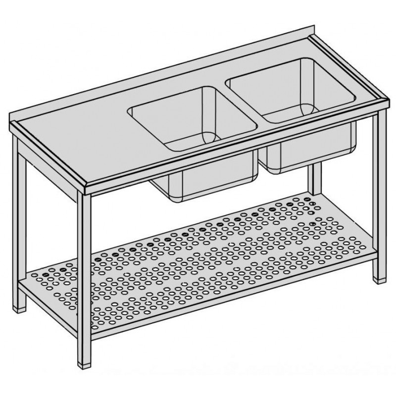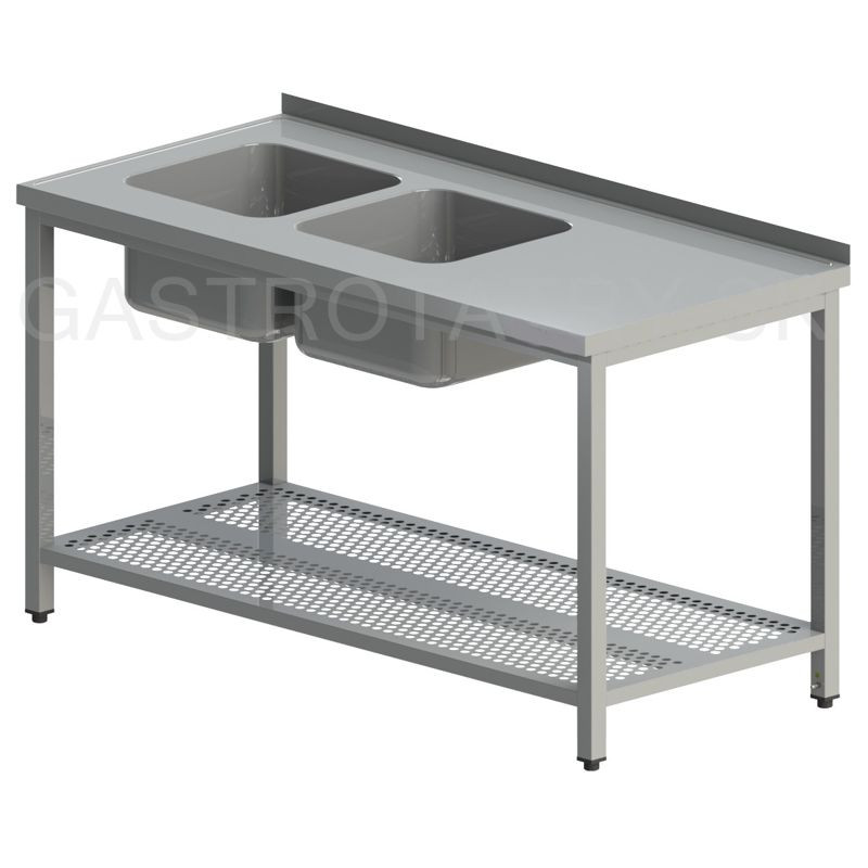 Umývací stôl s 2 drezmi a perforovanou policou, hĺbka 600, 700, 800 mm, šírka 1100 - 1900 mm, výška stola štandardne 850 mm ▪ možnosť vyhotovenia bez zadného lemu ▪ perforovaná polica ▪ vrch police 150 mm od zeme ▪ nosnosť police 50 kg