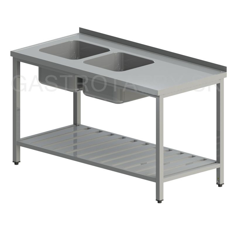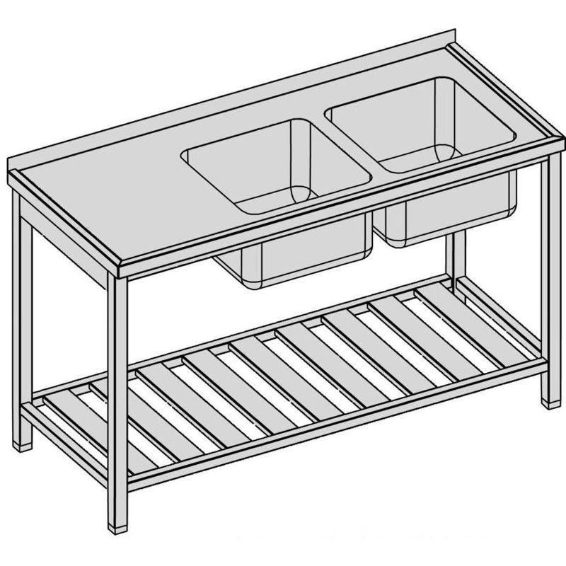 Umývací stôl s dvomi drezmi a roštovou policou, hĺbka 600, 700, 800 mm, šírka 1100 - 1900 mm, výška stola štandardne 850 mm ▪ možnosť vyhotovenia bez zadného lemu ▪ roštová polica ▪ vrch police 150 mm od zeme ▪ nosnosť police 50 kg