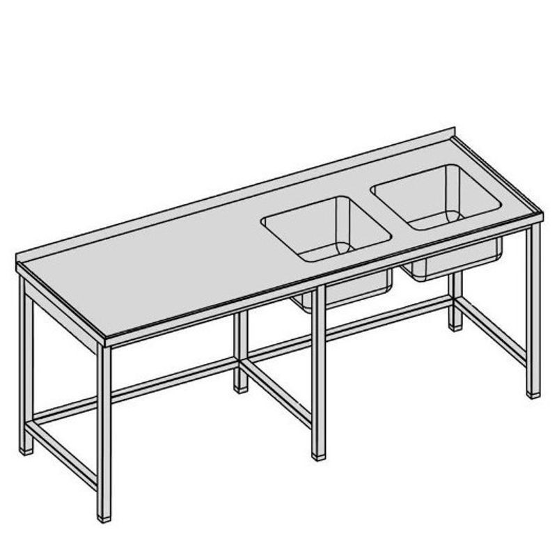 Umývací stôl s dvomi drezmi dlhý, hĺbka 600, 700, 800 mm, šírka 2000 - 2800 mm, výška stola štandardne 850 mm ▪ možnosť vyhotovenia bez zadného lemu