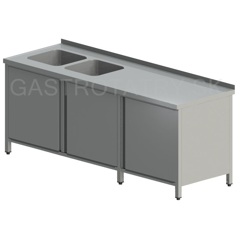 Umývací stôl s dvomi drezmi skrinkový dlhý, hĺbka 600 - 800 mm, šírka 1500 - 2000 mm, výška stola štandardne 850 mm ▪ možnosť vyhotovenia bez zadného lemu ▪ vrch spodnej police 150 mm od zeme ▪ nosnosť police 50 kg ▪ otváravé dvere ▪ krytovanie