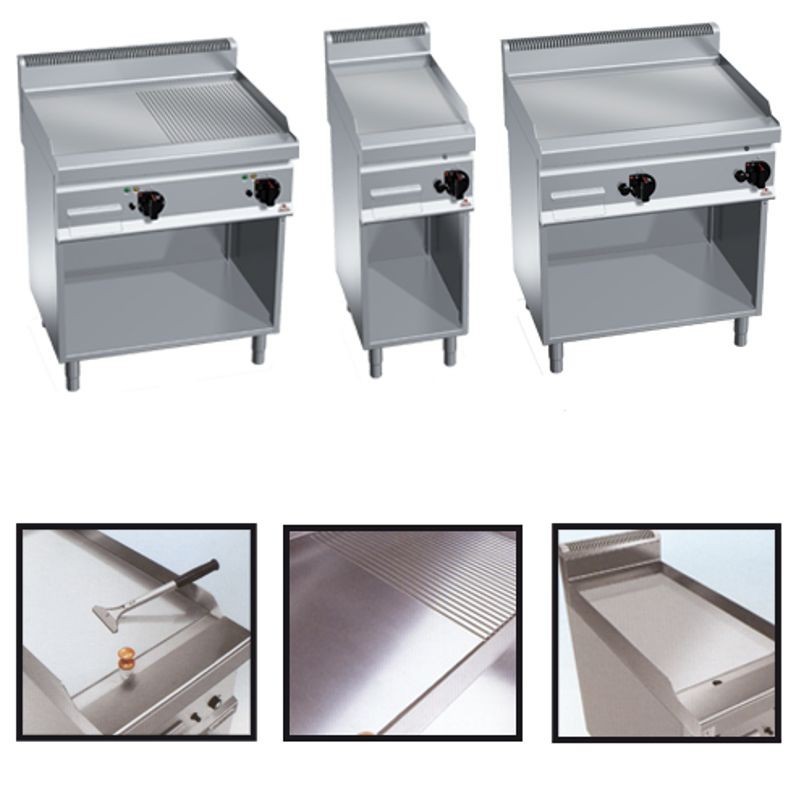 Plynová grilovacia platňa BERTO´s hladká / ryhovaná ▪ grilovacia plocha z hrubej nerezovej platne AISI 304 ▪ zberný žľab s prepadovým otvorom do zbernej zásuvky na tuk ▪ pomocou teflónovej zátky na uzavretie prepadového otvoru je možné použiť grilovaciu platňu ako panvicu (zátka je voliteľná) ▪ pri elektrickom grile regulácia teploty od 160°C do 320°C