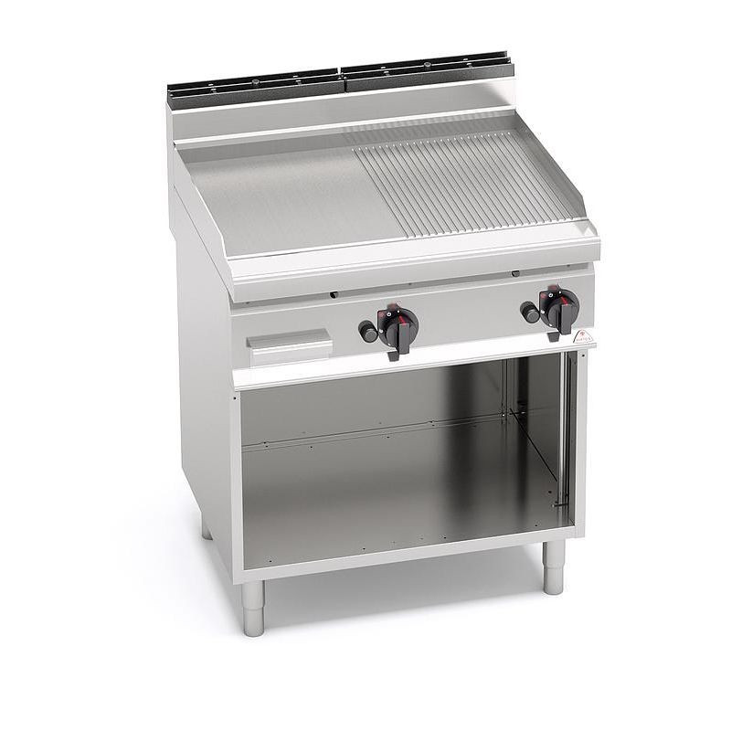 Plynová grilovacia platňa BERTO´s hladká / ryhovaná ▪ grilovacia plocha z hrubej nerezovej platne AISI 304 ▪ zberný žľab s prepadovým otvorom do zbernej zásuvky na tuk ▪ pomocou teflónovej zátky na uzavretie prepadového otvoru je možné použiť grilovaciu platňu ako panvicu (zátka je voliteľná) ▪ pri elektrickom grile regulácia teploty od 160°C do 320°C (7 polohový regulátor) ▪ pri plynovom grile horáky z nerezu s elektrickým zapaľovaním a pilotným plameňom ▪ dodávané bez dvierok (možné doobjednať) ▪ so zárukou 3 roky na náhradné diely ▪ dostupné aj trojzónové prevedenie so šírkou 1200 mm ▪ dostupné škrabky: BSPL - na hladké grily a BSPR - na ryhované grily. Rozmery 800 x 714 x 900 mm, povrch platne hladká/ryhovaná, grilovacia plocha 400 cm2, výkon plynu 13,8 kW, prípojka plzn G20