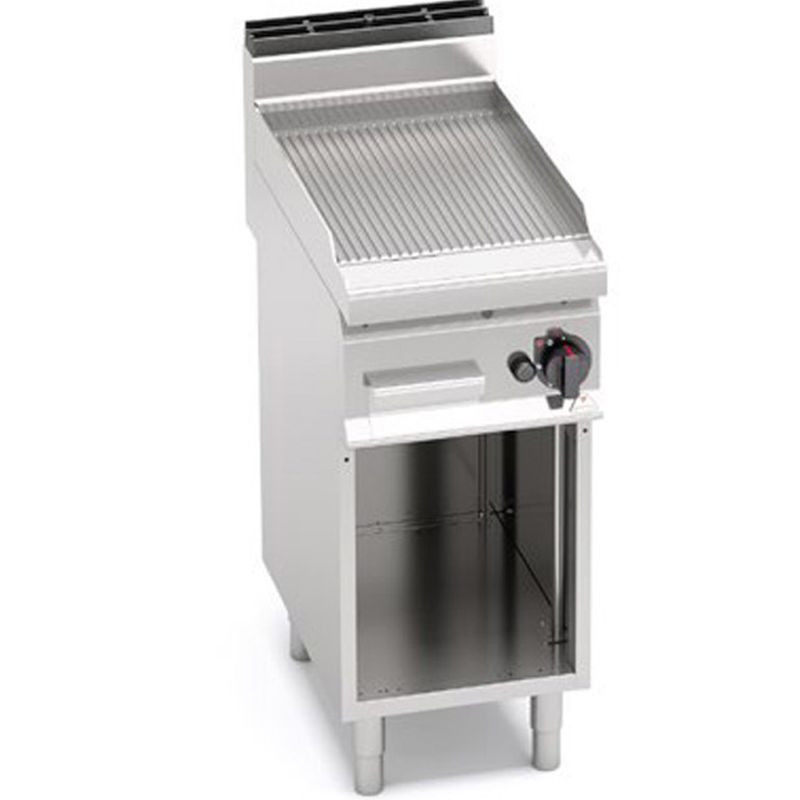 Plynová grilovacia platna BERTO´s ryhovaná ▪ grilovacia plocha z hrubej nerezovej platne AISI 304 ▪ zberný žľab s prepadovým otvorom do zbernej zásuvky na tuk ▪ pomocou teflónovej zátky na uzavretie prepadového otvoru je možné použiť grilovaciu platňu ako panvicu (zátka je voliteľná) ▪ pri elektrickom grile regulácia teploty od 160°C do 320°C (7 polohový regulátor) ▪ pri plynovom grile horáky z nerezu s elektrickým zapaľovaním a pilotným plameňom ▪ dodávané bez dvierok (možné doobjednať) ▪ so zárukou 3 roky na náhradné diely ▪ dostupné škrabky: BSPL - na hladké grily a BSPR - na ryhované grily. Rozmery 400 x 714 x 900 mm, povrch platne ryhovaná, grilovacia plocha 200 cm2, výkon plyn 6,9 kW, prípojka plyn G20