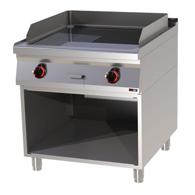 Platňa grilovacia elektrická, model FTHRC-90/80E, 1/2 hladká,1/2 ryhovaná plaňa, chrómovaná. Rozmery 800x900x900 mm, prípojka 400 V, príkon 12 kW, er platne: 710x650 mm, prevedenie: chrómovaná, regulácia teploty: 50-300°C, na otvorenej podstavbe, zásuvka na odkvapkávajúci tuk, príslušenstvo na objednávku: -dvere, hmotnosť 142 kg