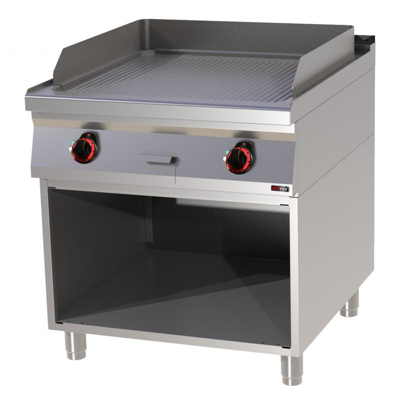 Platňa grilovacia elektrická, model FTR-90/80E, ryhovaná platňa. Rozmery 800x900x900 mm, prípojka 400 V, príkon 12 kW, rozmer platne: 710x650 mm, prevedenie: teplovodivá oceľ, regulácia teploty: 50-300°C, na otvorenej podstavbe, zásuvka na odkvapkávajúci tuk, príslušenstvo na objednávku: -dvere, hmotnosť 142 kg