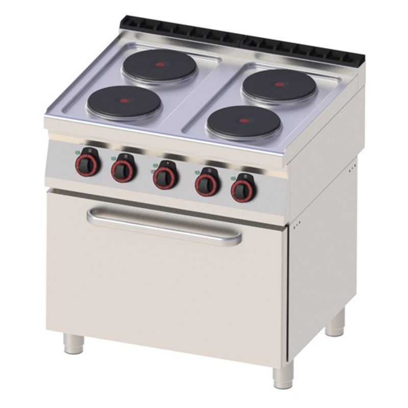 Sporák elektrický s rúrou, model SPT-70/80-21E, rozmery 800x700x900 mm, prípojka 400 V, príkon 16,7 kW, elektrický príkon platní: 4x2,6 kW, počet platní: 4 ks,