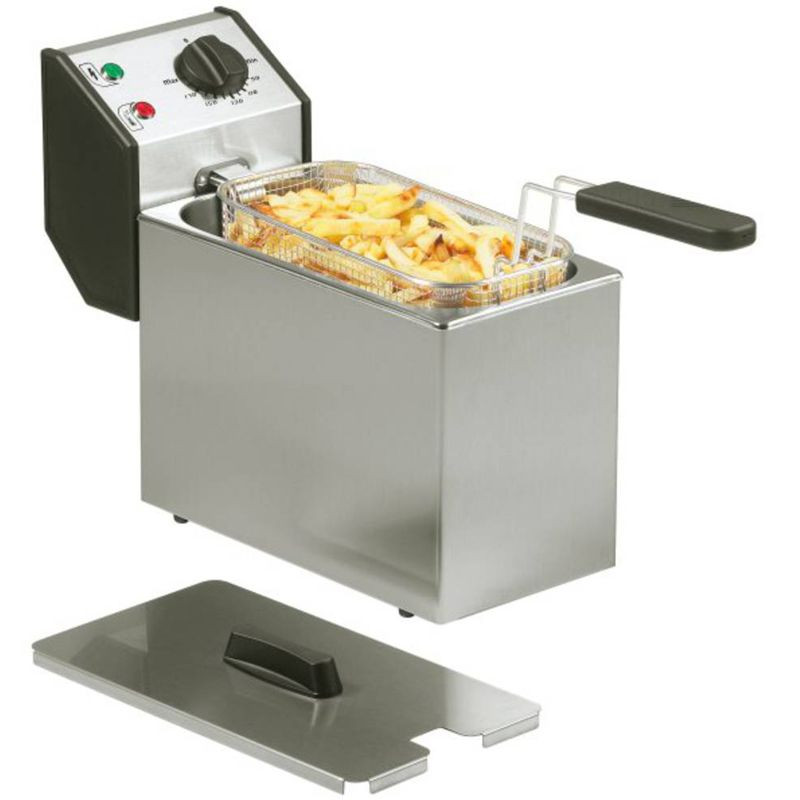 Stolová fritéza z nehrdzavejúcej ocele vhodná nielen pre rýchle občerstvenie, ale pre všetky typy gastronomických prevádzok. Citlivý regulačný termostat umožňuje presné nastavenie pracovnej teploty, poistný termostat chráni výhrevné teleso pred jeho spálením. Automatická filtrácia oleja. Nádobu na olej (kapacita 5 l) je možné umývať v umývačke riadu. Silnejšie výhrevné teleso, ktoré umožňuje rýchlejšiu a kvalitnejšiu prípravu jedál. Rukoväť košíka vyrobená z tepelne odolného materiálu. Ľahko rozoberateľné jednotlivé časti fritézy (veko, výhrevné teleso, košík, nádoba) pre ľahšie čistenie.