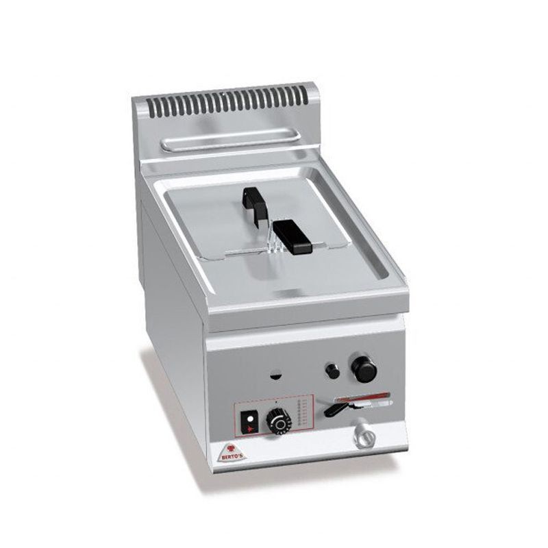 Plynová stolová fritéza BERTO´S - 8 litrov ▪ s veľkou studenou zónou na zachytávanie zvyškov potravín ▪ s bezpečnostným termostatom ▪ lisovaná vaňa vyrobená z AISI 304 ▪ regulácia teploty v 8 polohách od 110 do 190 °C ▪ priemerný čas fritovania: 5 minút ▪ čas predhrievania: 15 minút (od 20 do 190 °C) ▪ s elektrickým piezzo zapaľovaním a pilotným plameňom ▪ možnosť objednať aj 2 polovičné koše ▪ na zemný plyn s možnosťou pretryskovania na propán-bután (trysky na PB pribalené). Rozmery 300 x 600 x 290 mm, rozmery koša 207 x 295 x 110 mm, objem 8 l, výkon 6,6 kW, typ plynu G20