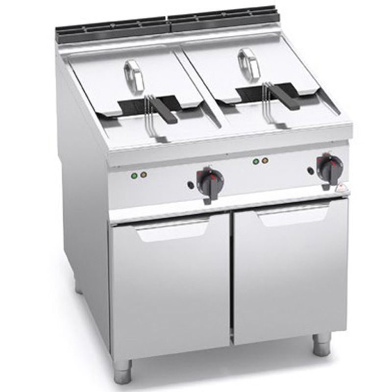 Elektrická fritéza BERTO´s, objem 2 x 22 l ▪ lisované vane a výklopné špirály z inkoloy-nerezu pre jednoduché čistenie ▪ s výpustným ventilom a nádržkou na znečistený olej ▪ elektrické fritézy s reguláciou teploty do 190 °C a s poistným termostatom ▪ plynová fritéza je vybavená nerezovými horákmi, elektrickým zapaľovaním a pilotným plameňom ▪ 7 polohový plynový termostat ▪ so zárukou 3 roky na náhradné diely. Rozmery 800 x 900 x 900 mm, rozmery koša 2x 260 x 400 x 150 mm, prípojka 400 V, príkon 36 kW