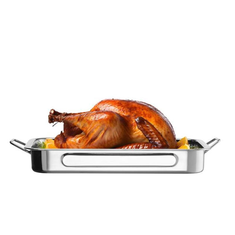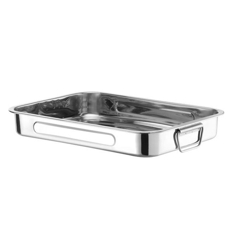 Nerezový pekáč, rozmery 430x310x(H)60 cm, Vhodný iba na pečenie v rúrach. S rúčkami, odolný do 250 C. S rukoväťami. Vhodné len pre rúry, vyhýbajte sa kontaktu. S priamym ohňom.