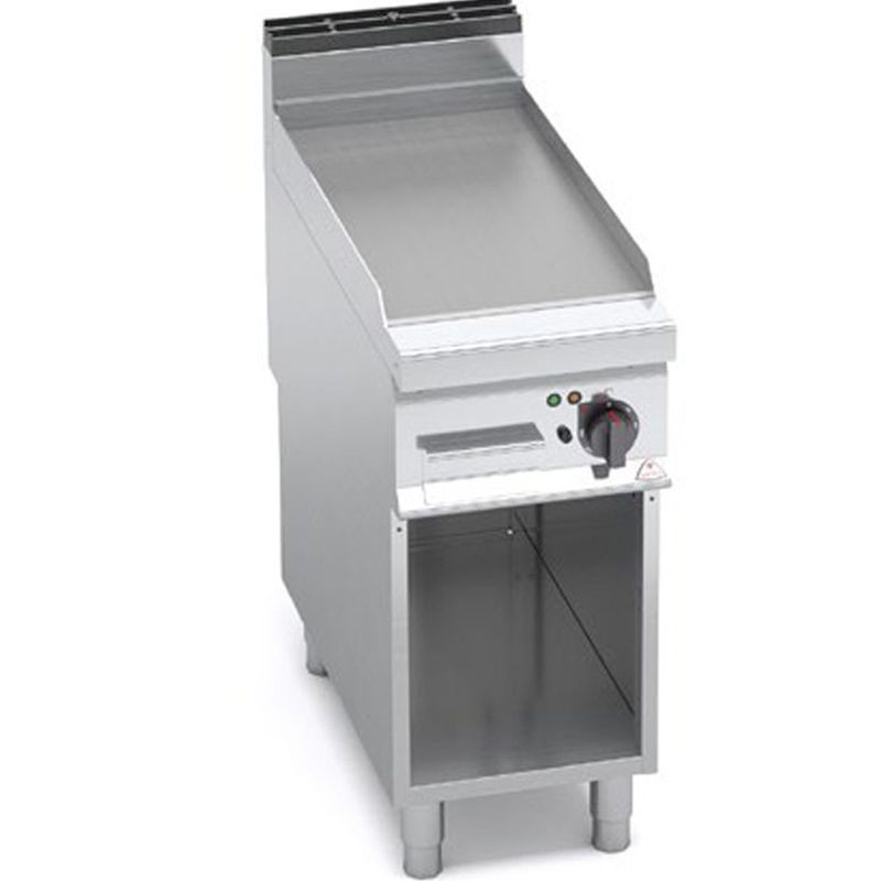 Plynová grilovacia platna BERTO´s hladká 400 mm ▪ grilovacia plocha s bočným lemom zabraňujúcim striekaniu oleja mimo grilovacej plochy, vzadu vysoký komín ▪ grilovacia plocha z hrubej nerezovej ocele AISI 304 ▪ s hladkým povrchom (dostupný aj ryhovaný alebo hladký/ryhovaný povrch) ▪ zberný žľab s prepadovým otvorom do zbernej zásuvky na tuk