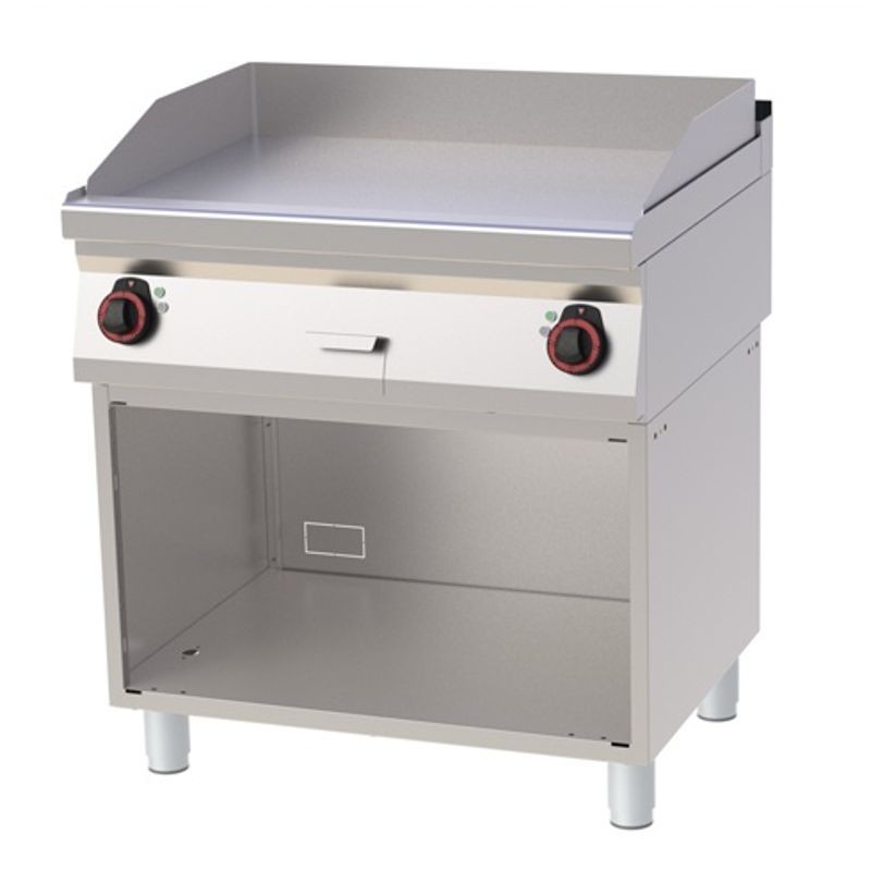 Platňa grilovacia elektrická, model FTH-70/80E, platňa hladká. Rozmery 800x700x900 mm, prípojka 400 V, príkon 9 kW, rozmer platne: 796x510 mm, prevedenie: teplovodivá oceľ, regulácia teploty: 50-360°C, na otvorenej podstavbe, zásuvka na odkvapkávajúci tuk, príslušenstvo na objednávku:-dvere