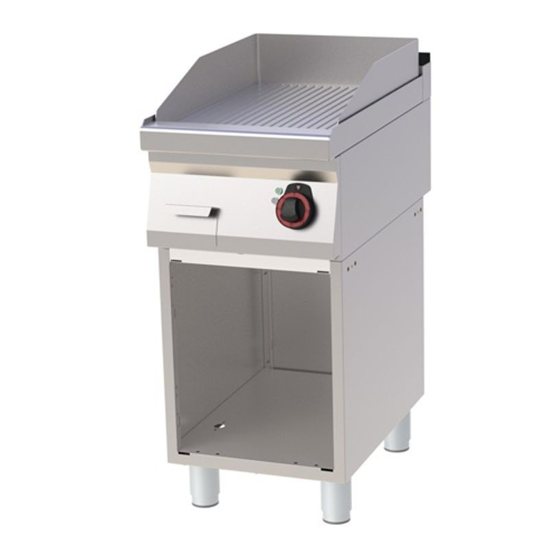 Platňa grilovacia elektrická, model FTR-70/40E, rozmery 400x700x900 mm, prípojka 400 V, príkon 4,5 kW, rozmer platne: 396x510 mm, platňa:ryhovaná, prevedenie: teplovodivá oceľ, regulácia teploty: 50-360°C, na otvorenej podstavbe, zásuvka na odkvapkávajúci tuk, príslušenstvo na objednávku:-dvere