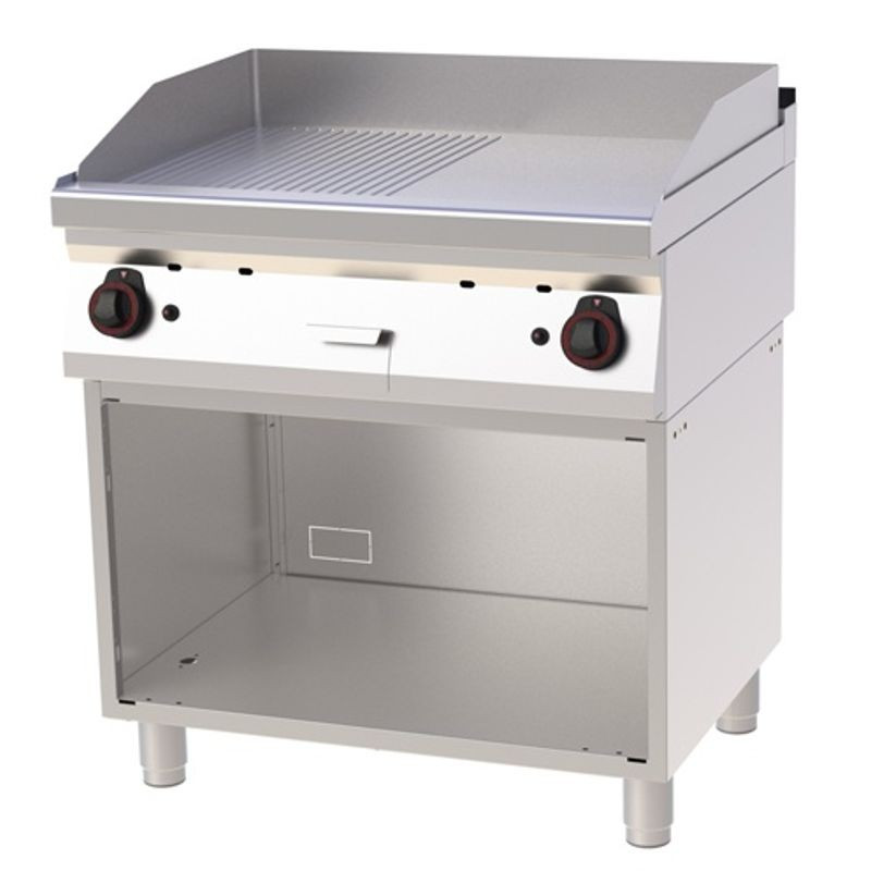 Platňa grilovacia plynová, model FTHR-70/80G, platňa: 1/2 hladká, 1/2 ryhovaná. Rozmery 800x700x900 mm, príkon plyn 14 kW, rozmer platne: 796x510 mm, prevedenie: teplovodivá oceľ, regulácia teploty: 50-360°C, na otvorenej podstavbe, zásuvka na odkvapkávajúci tuk, príslušenstvo na objednávku: -dvere