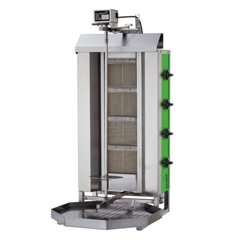 Plynový stroj na kebab Gastromarket 60 - vyrobené z nerezu, na zemný plyn (možnosť pretryskovania na propán-bután) - motor na otáčanie je uložený hore, s ražňom, tanierom k ražňu a držiakom - max. hmotnost mäsa: 40 - 60 kg, max. výška mäsa 700 mm, so zachytávacou vaničkou, 4 horáky - rozmery: 550 x 700 x 1120 mm, výkon plyn 13 kW, prípojka plyn G20