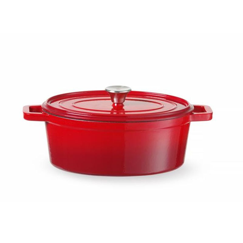 Liatinový smaltovaný kastról, objem 4,4 l, červený. Rozmery 365x290x(H)115 mm.