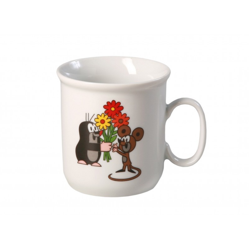 Karlovarský porcelán. Krtko hrnček - myška s kyticou (Gaston), výška: 8,00 cm, priemer: 8,00 cm.