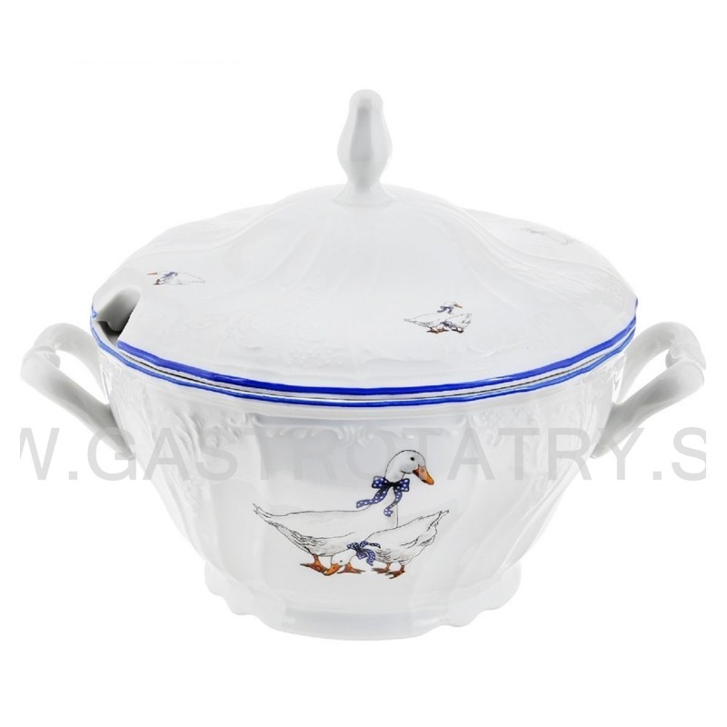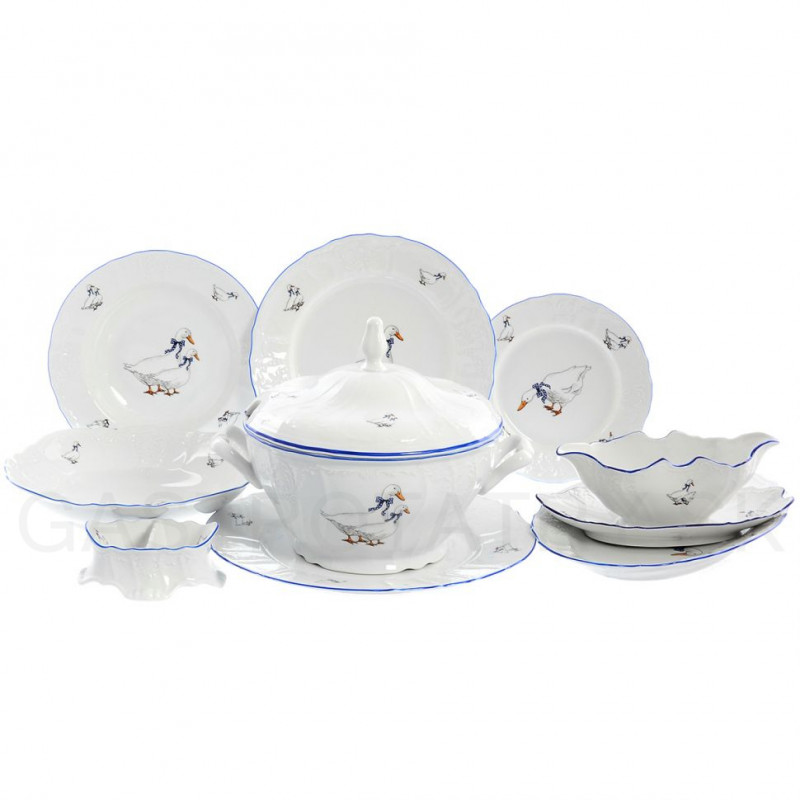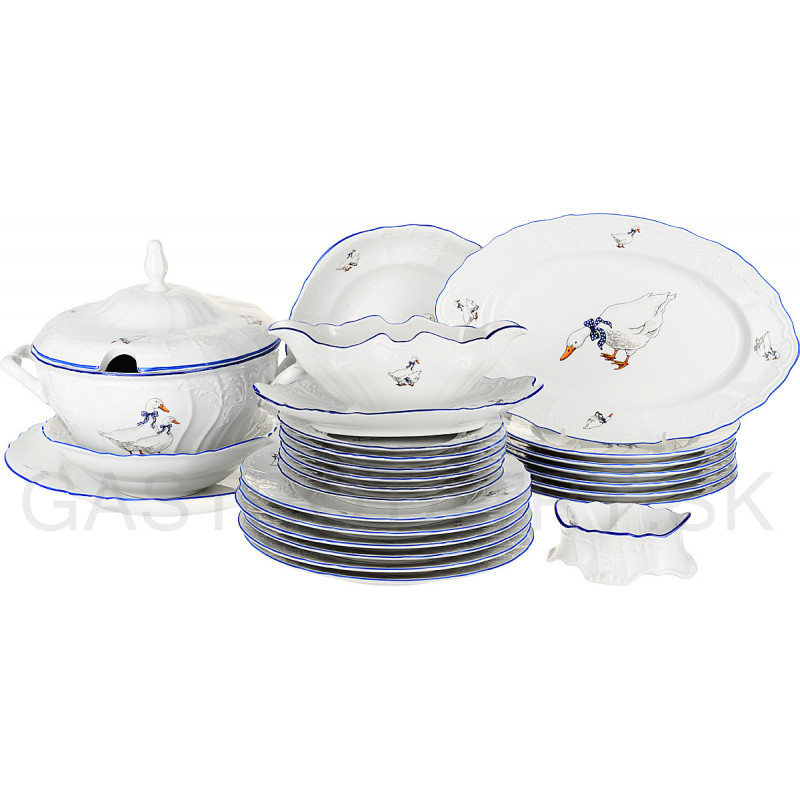 Karlovarský porcelán - Bernadotte obedová SP 26 dielna husi. Obsahuje: 1x misa polievková s viečkom 2,5 l, 1x omáčník s podšálkou, 1x misa kompótová 25 cm, 1x misa kompótová 23 cm, 1x misa oválna 34 cm, 1x misa plytká 30 cm, 6x tanier plytký 25 cm,, 6x tanier hlboký 23 cm,, 6x tanier dezertný 19 cm, 1x soľnička-korenička 2 dielna