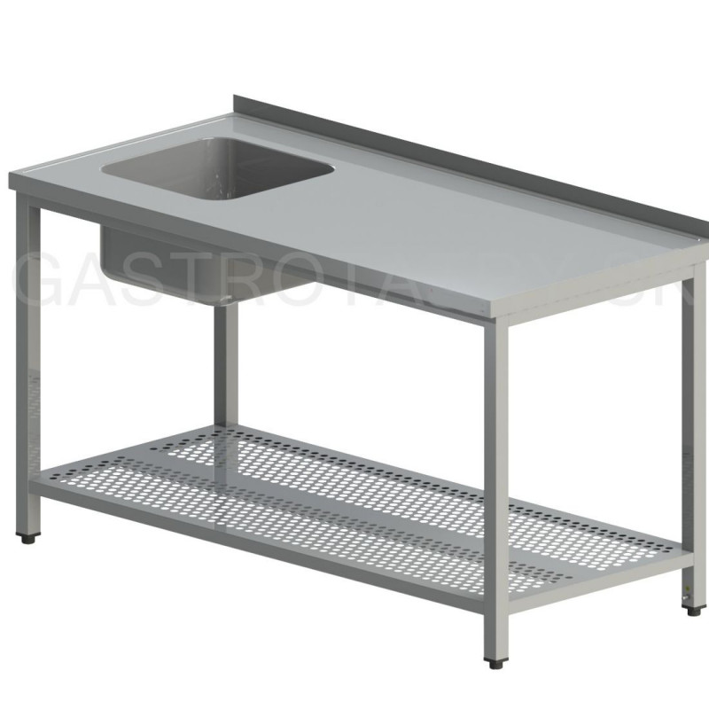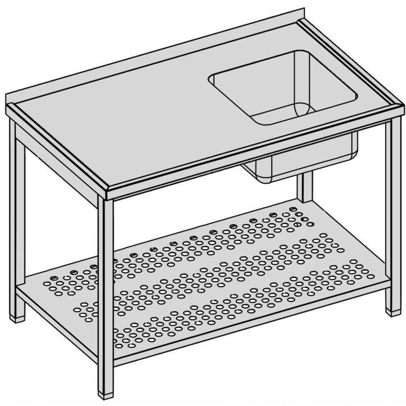 Umývací stôl s drezom a perforovanou policou, hĺbka 600, 700, 800 mm, šírka 800 - 1900 mm, výška stola štandardne 850 mm ▪ bez lemu ▪ perforovaná polica ▪ vrch police 150 mm od zeme ▪ nosnosť police 50 kg. Drez lisovaný 400x400x250 mm, bez otvoru na batériu