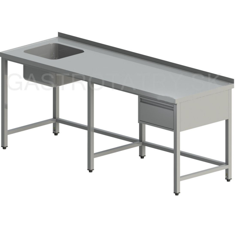 Umývací stôl s drezom a zásuvkou dlhý, hĺbka 600, 700, 800 mm, šírka 2000 - 2800 mm, výška stola štandardne 850 mm ▪ možnosť vyhotovenia bez zadného lemu ▪ 1x zásuvka